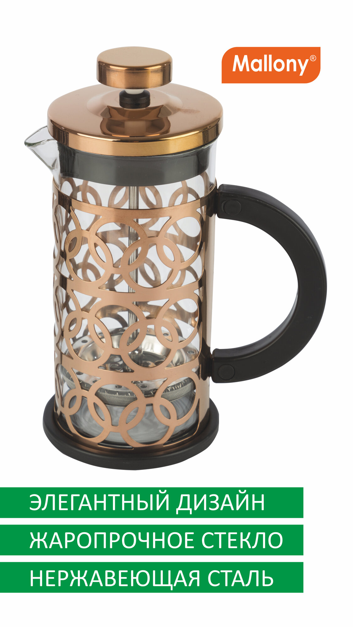 Купить Френч - пресс для чая и кофе из жаропрочного стекла в корпусе из нержавеющей стали Mallony Bronzo, объем: 350 мл