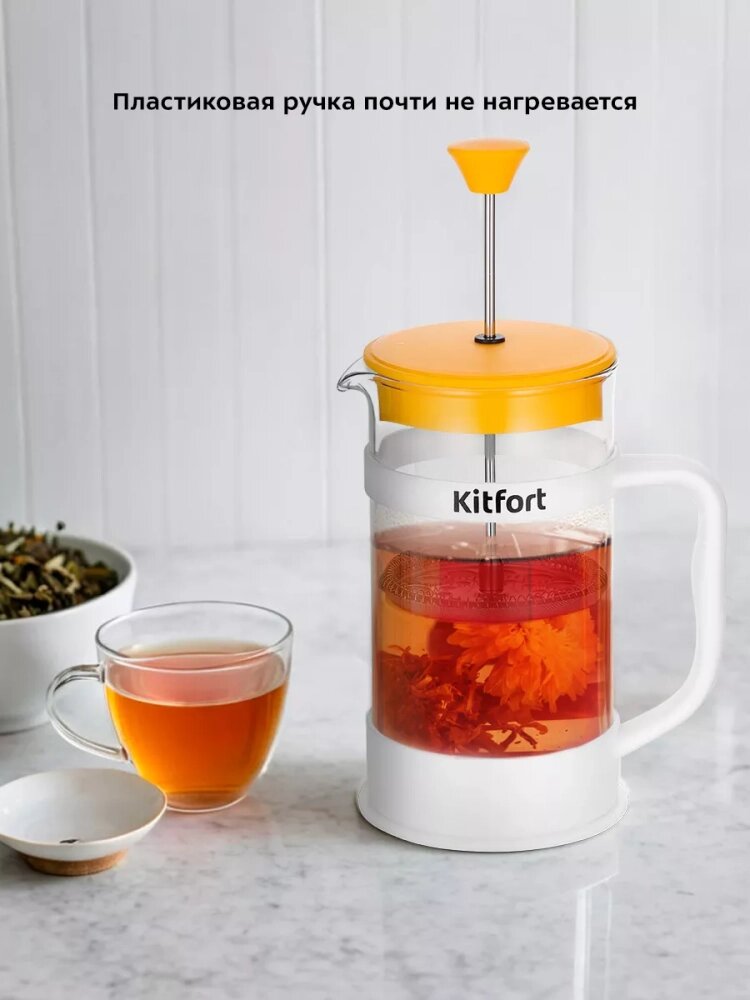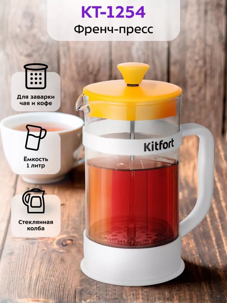 Френч-пресс Kitfort КТ-1254, для кофе и чая, стеклянный корпус, 1л, желтый интересное: