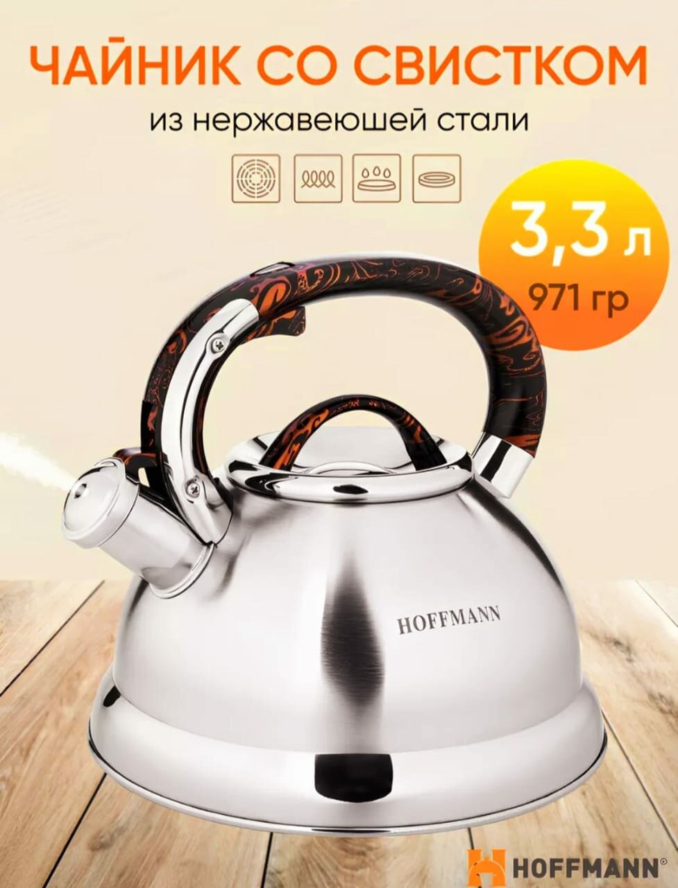 Купить "Чайник HOFFMAN" со свистком, объем 3,3 л