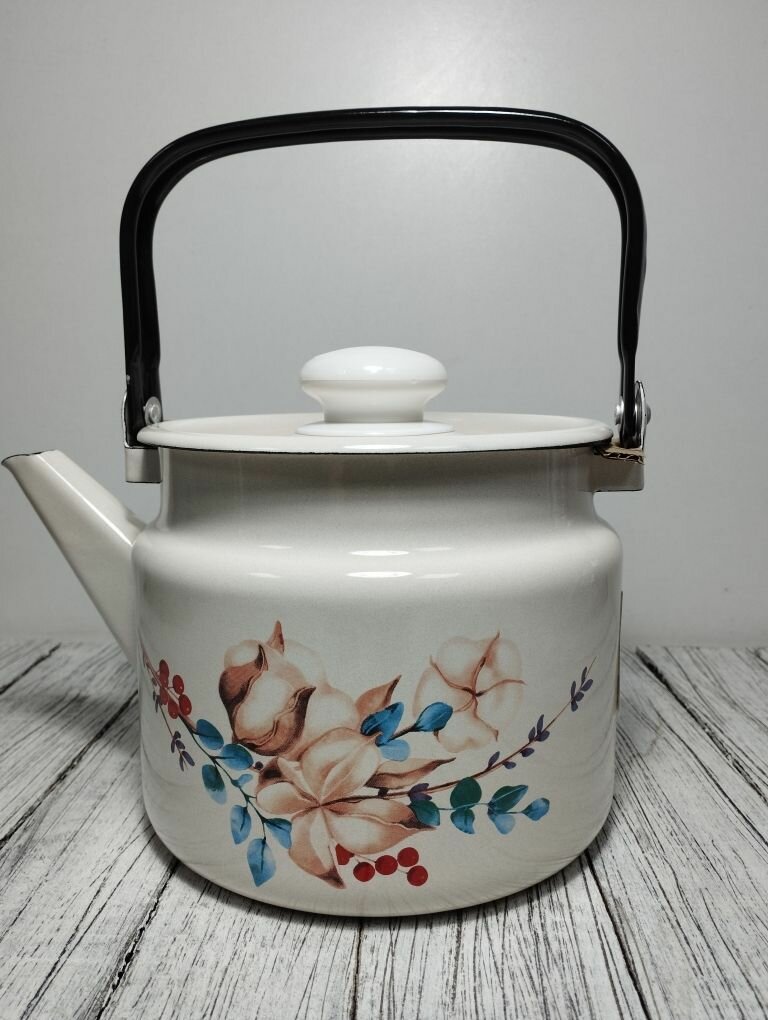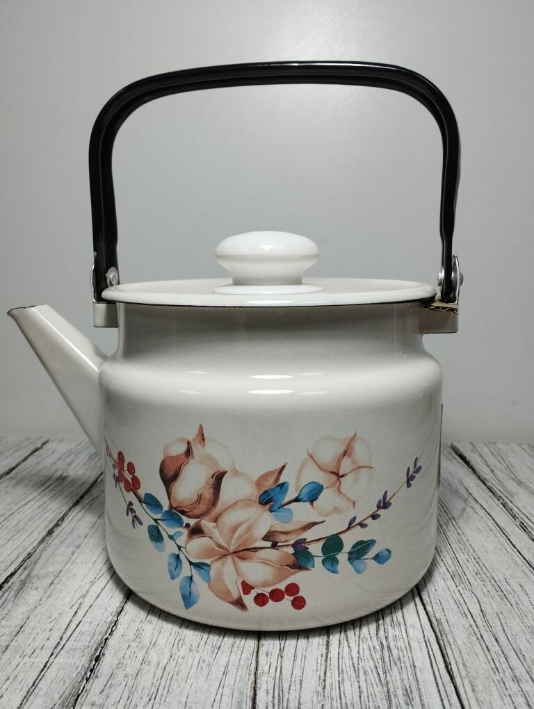 Чайник эмалированный 2 литра Лысьва кремовый, летний этюд, подвижная ручка, все виды плит, индукция