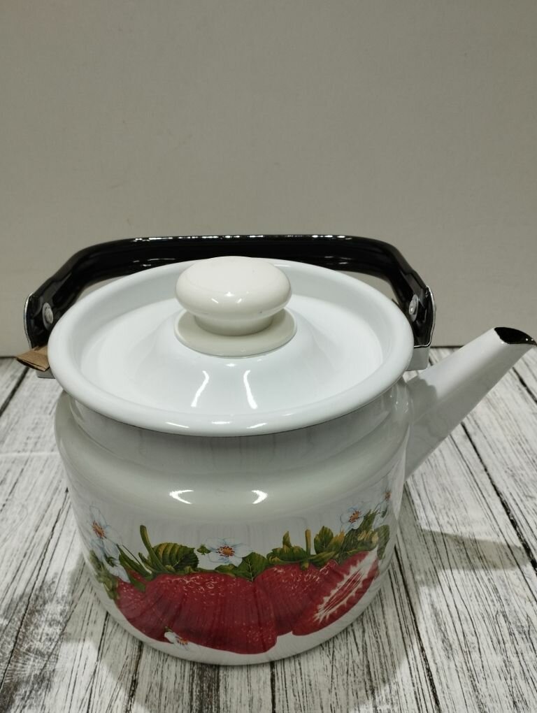 Купить Чайник эмалированный 2 литра Лысьва белый, сочная клубника, подвижная ручка, все виды плит, индукция