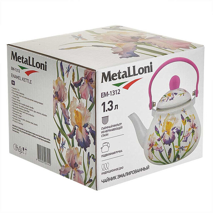 Купить Чайник эмалированный EM-1312 Ирисы, 1.3л, трехслойное покрытие, съемный фильтр, для всех типов плит, белый
