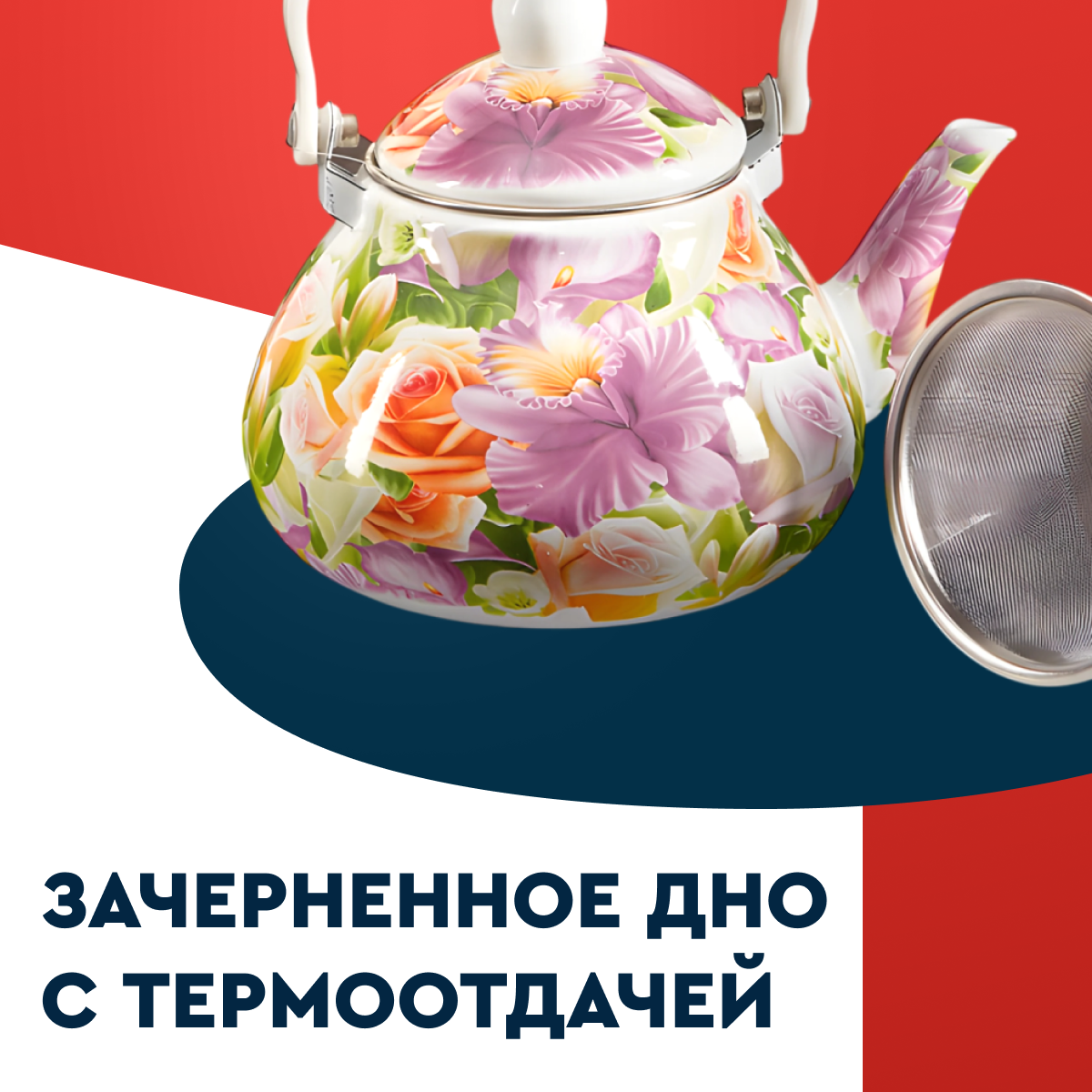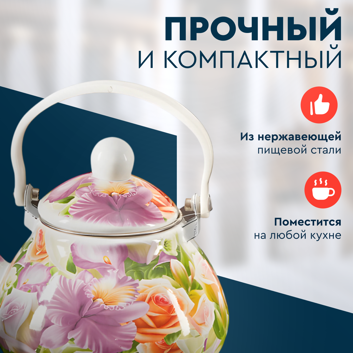 Купить Чайник эмалированный EM-131X1/8 "Орхидея", 1.3л, нержавеющая сталь, съемный фильтр, для всех типов плит, белый