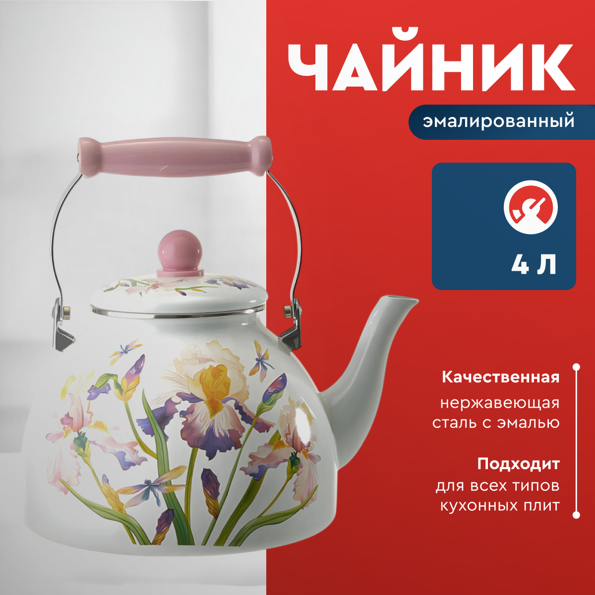 Купить Чайник эмалированный EM-1316 "Ирисы", 4 литра, зачерненное дно, для всех типов плит, белый