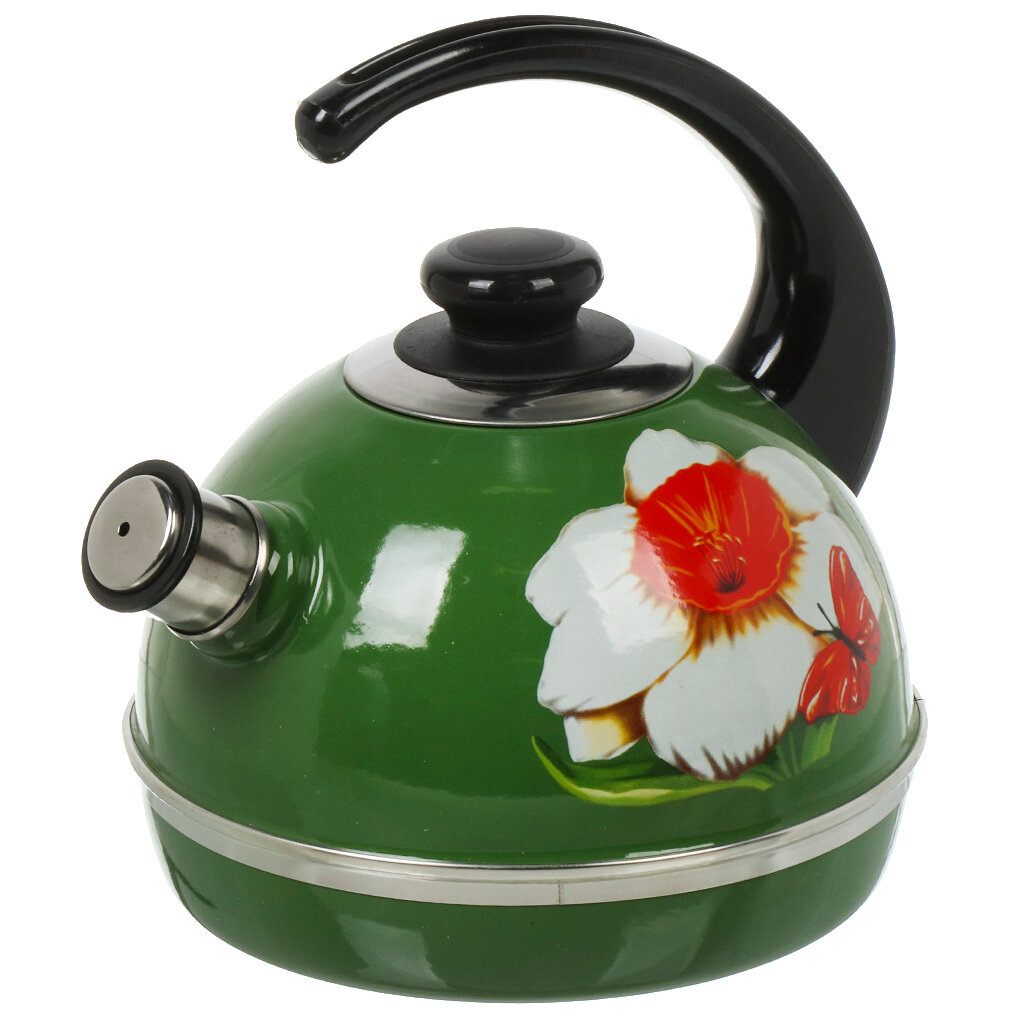 Рубин чайник для плиты из эмалированной стали со свистком, 2.5 л, зеленый, Маковый цветок