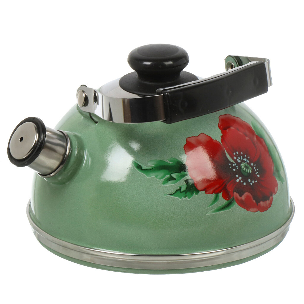 Купить Рубин чайник для плиты из эмалированной стали со свистком, 2.5 л, зеленый, Маковый цветок