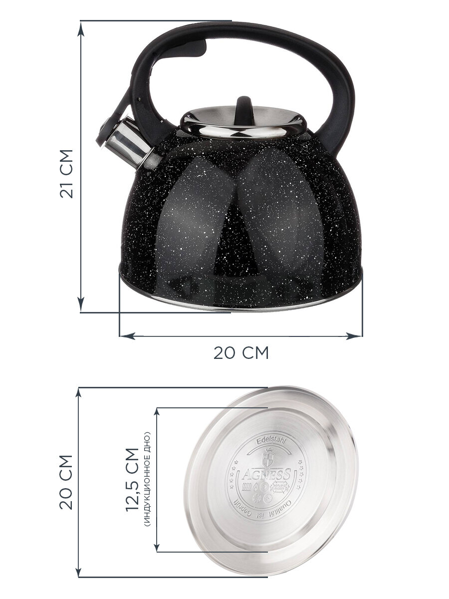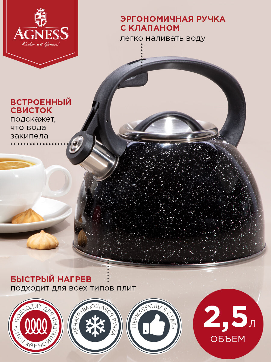 Чайник Agness "Черный Мрамор", со свистком, 2,5 л, капсульное дно, для всех видов плит интересное: