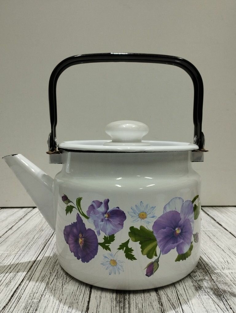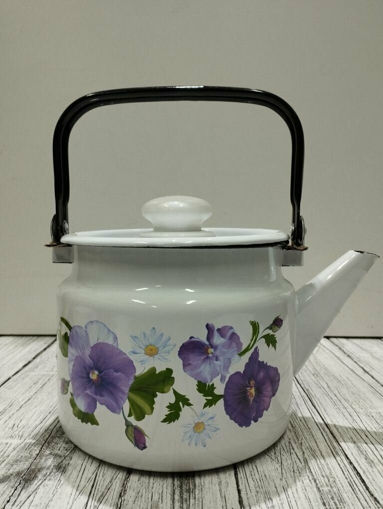 Купить Чайник эмалированный 2 литра Лысьва белый, анютины глазки, подвижная ручка, все виды плит, индукция