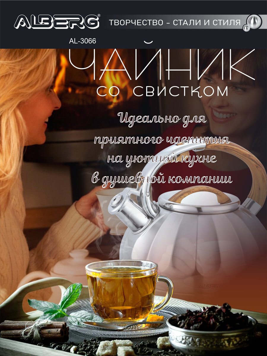 Купить Чайник для плиты со свистком ALBERG AL-3066 3 литра, свисток, нержавеющая сталь 0.6мм, зеркальная полировка, ручка Soft Touch, 7-ми слойное дно, индукция