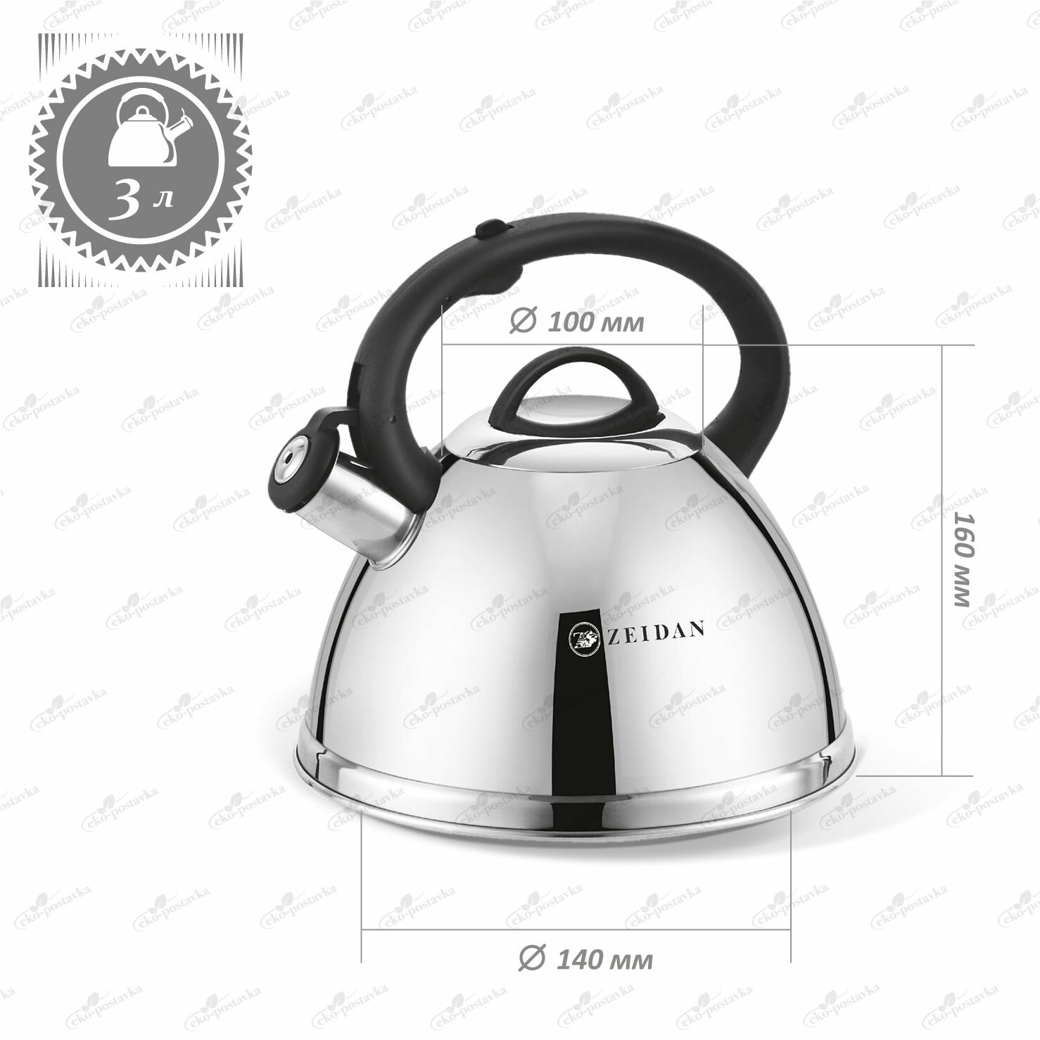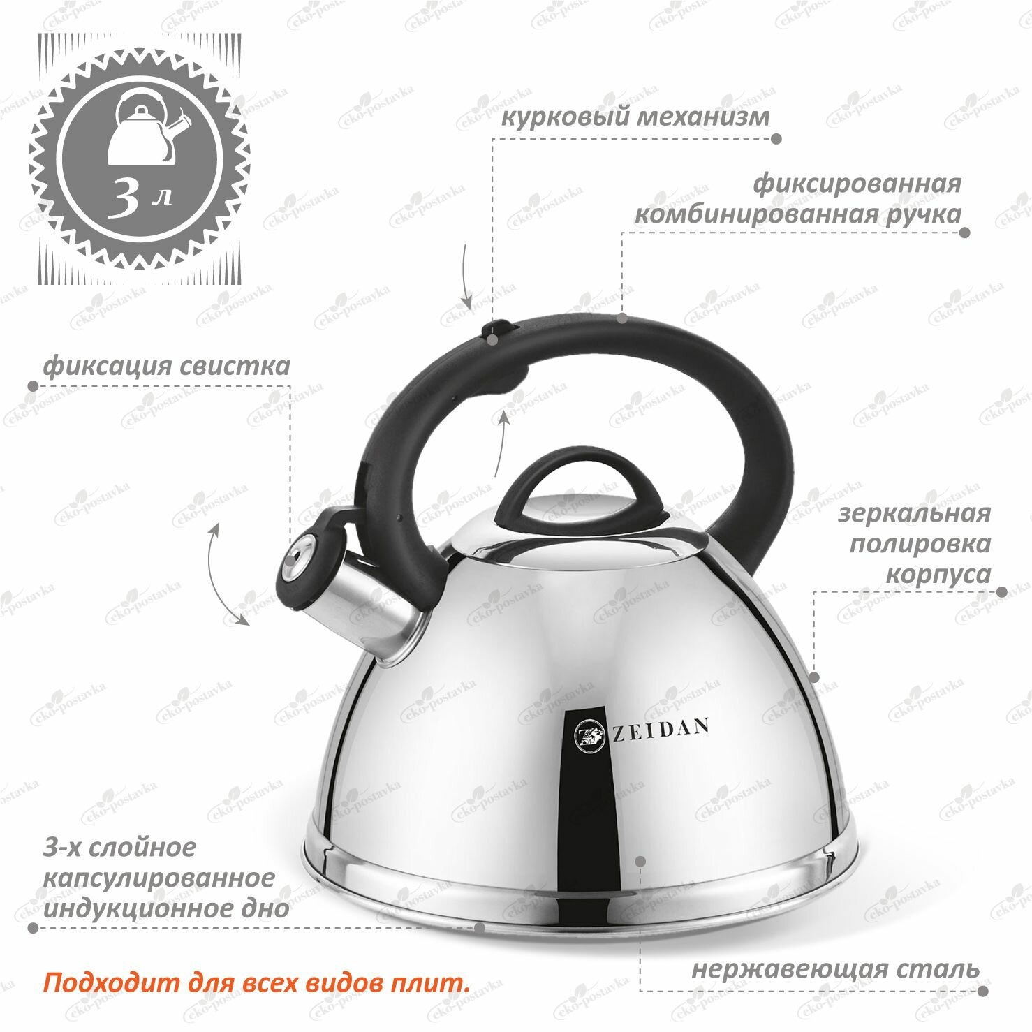 Чайник со свистком 3 литра из нержавеющей стали ZEIDAN для газовой, электрической и индукционной плиты