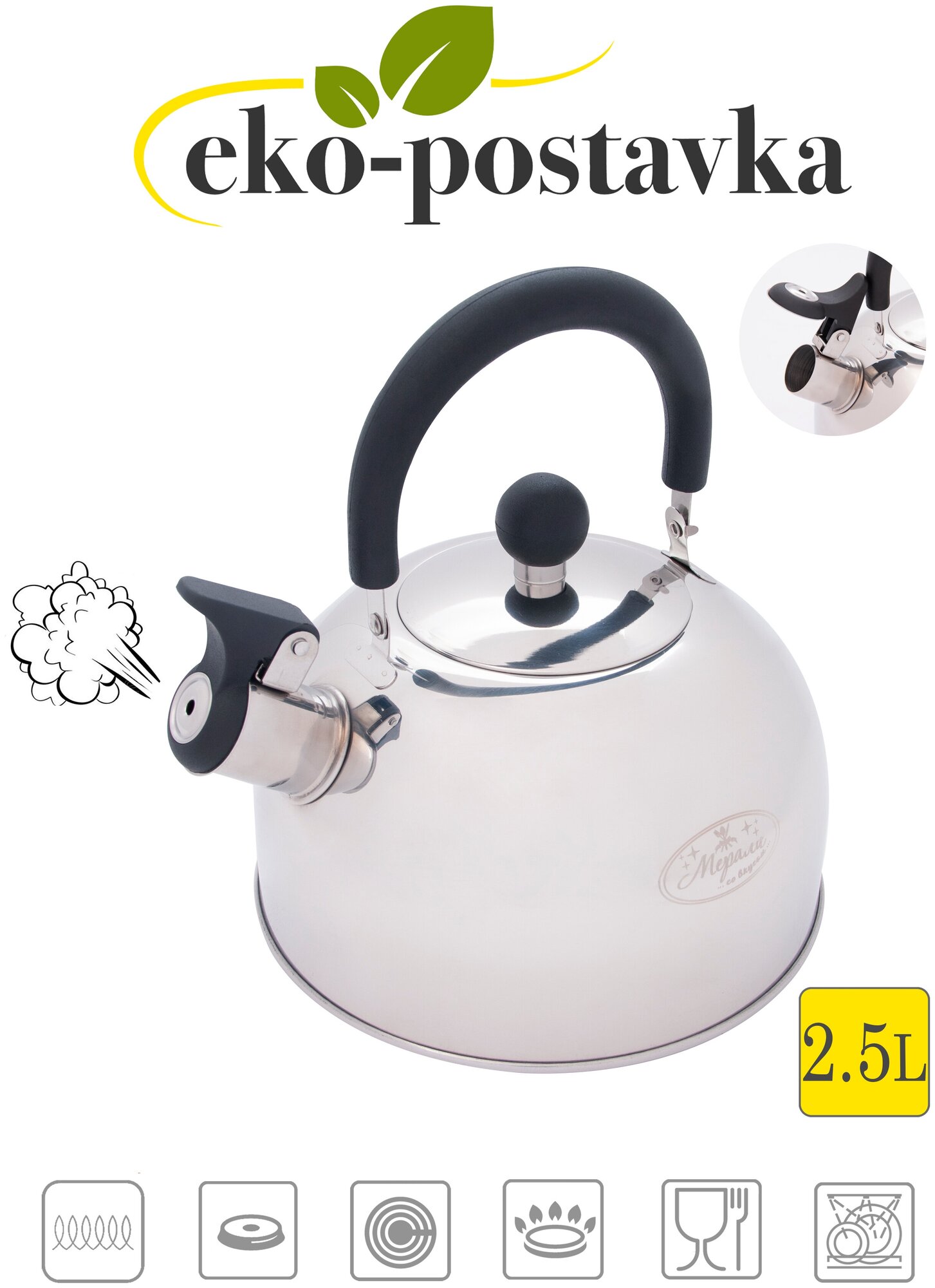 Купить Чайник со свистком 2,5 литра Мерали из нержавеющей стали для всех видов плит поворотная ручка