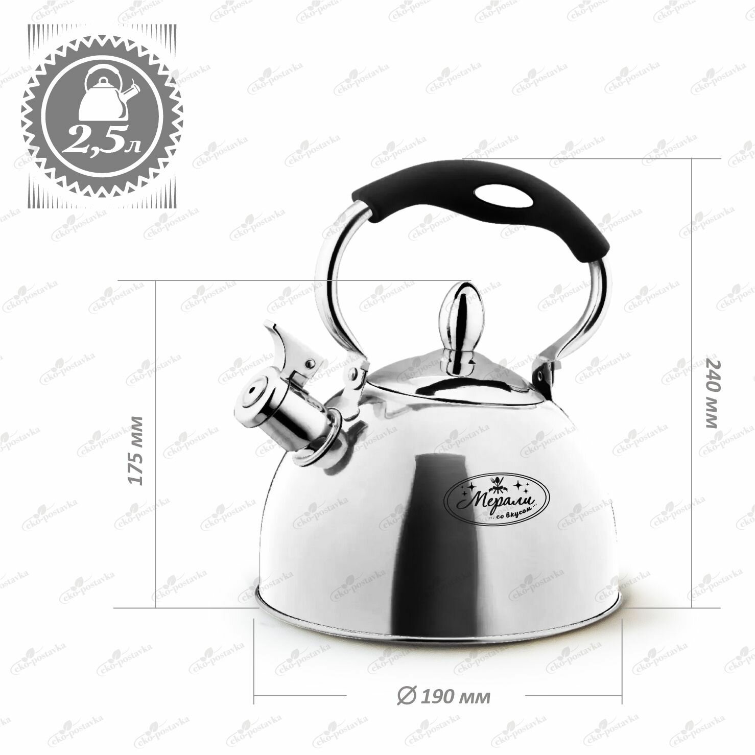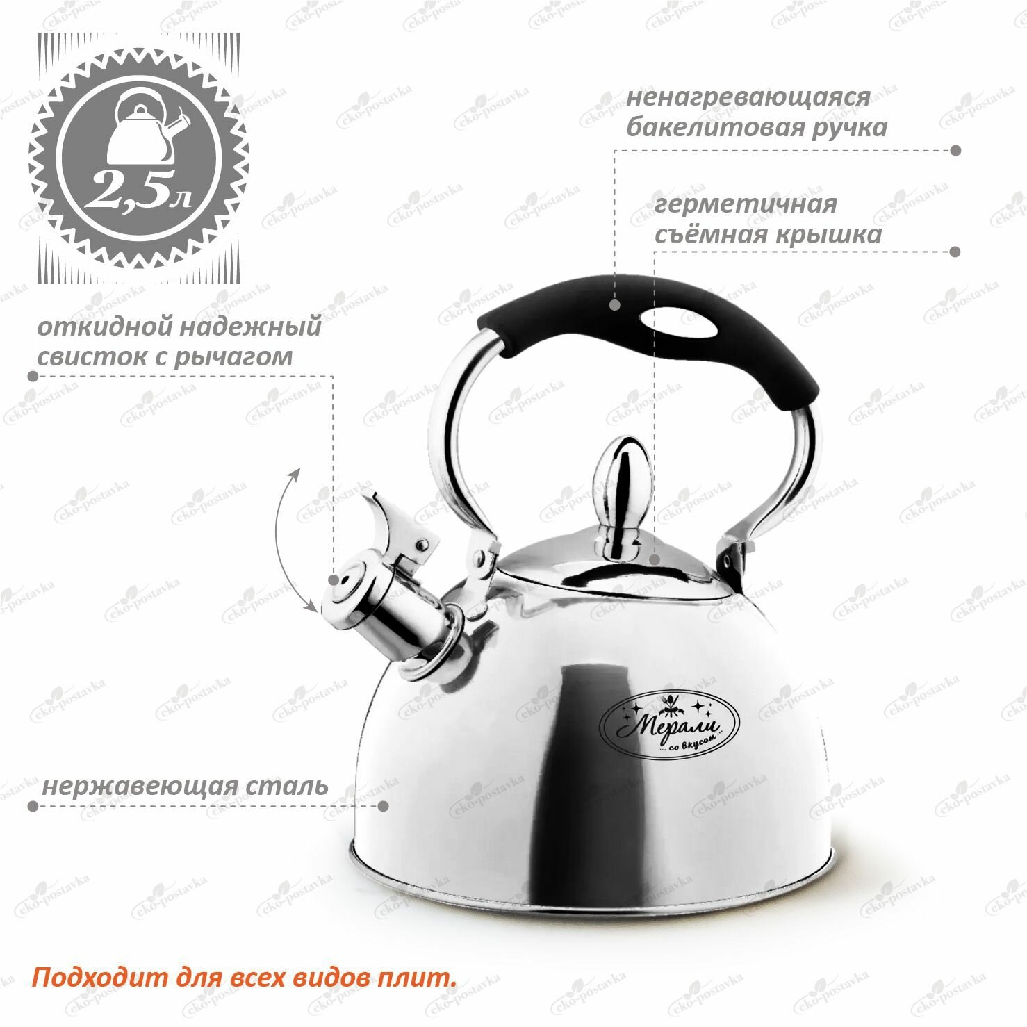 Чайник со свистком 2,5 литра Мерали из нержавеющей стали для всех видов плит поворотная ручка