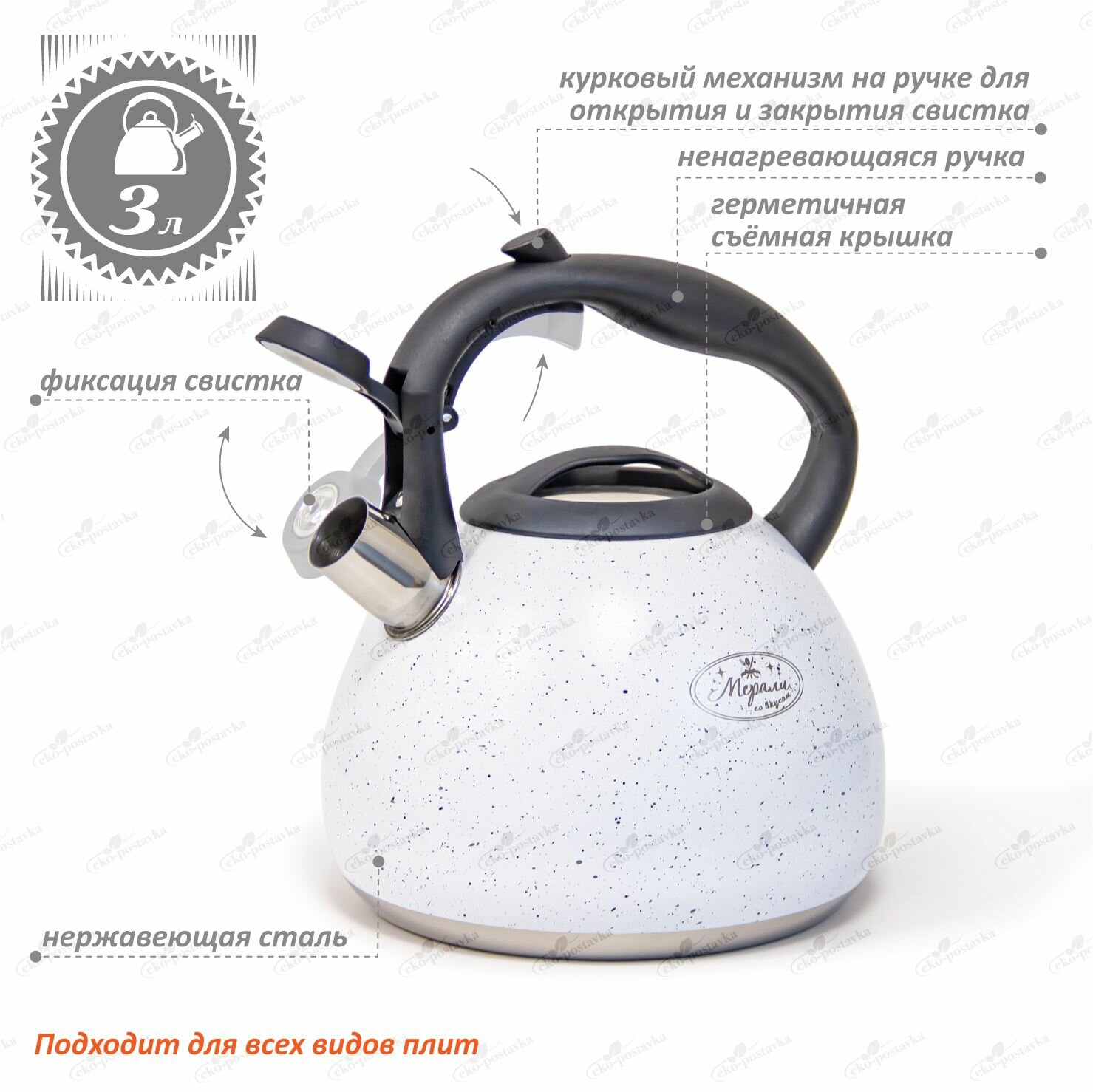 СохранитьЧайник из нержавеющей стали с фиксированной ручкой Мерали со свистком 3 литра для всех видов плит включая индукционную интересное: