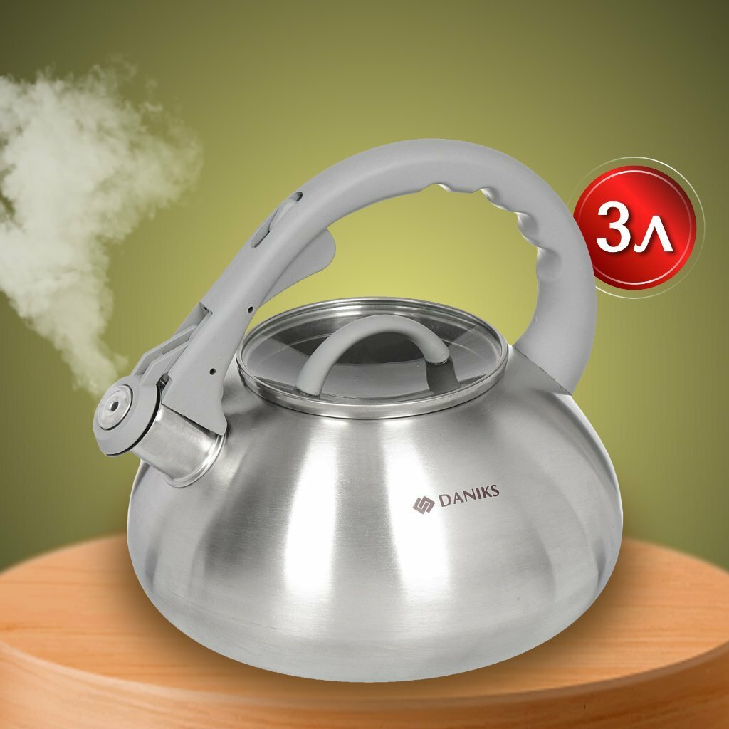 Купить Чайник Daniks DSC-8801, 3 л, нержавеющая сталь, со свистком, матовый, ручка с силиконовым покрытием, логотип меняет цвет