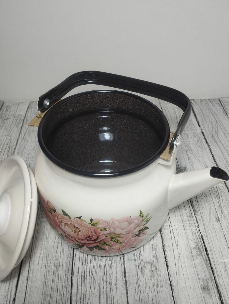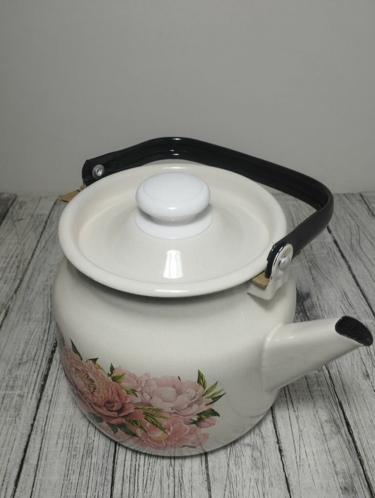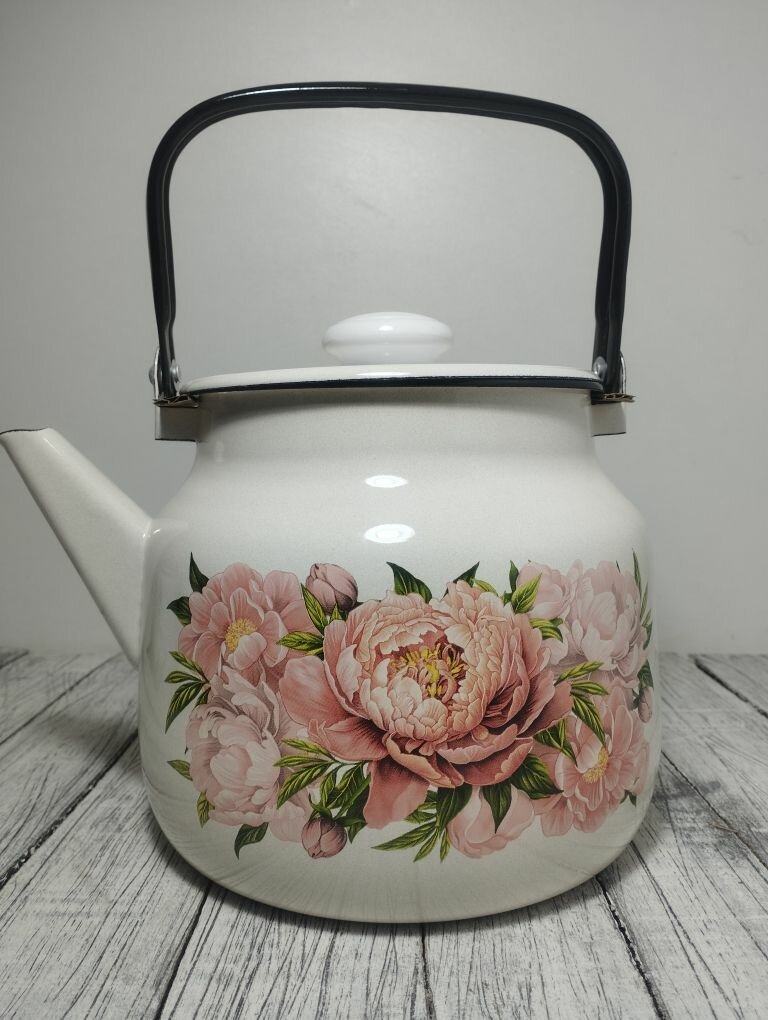 СохранитьЧайник эмалированный 3,5 литра Лысьва кремовый, букет пионов, подвижная ручка, все виды плит, индукция интересное: