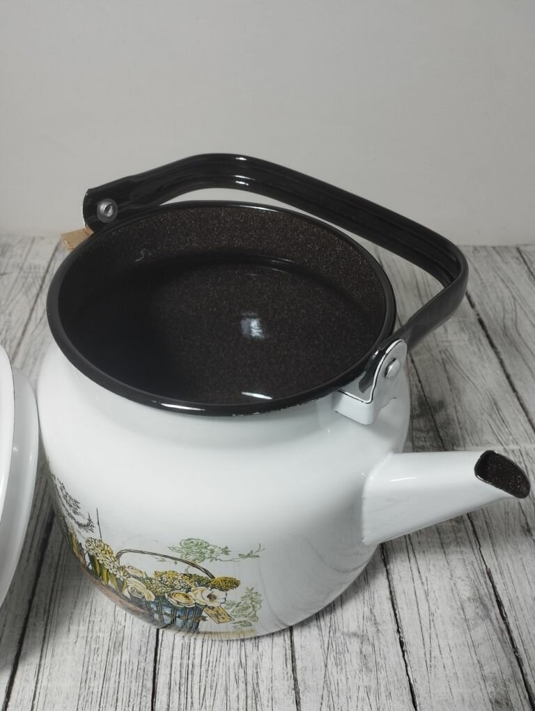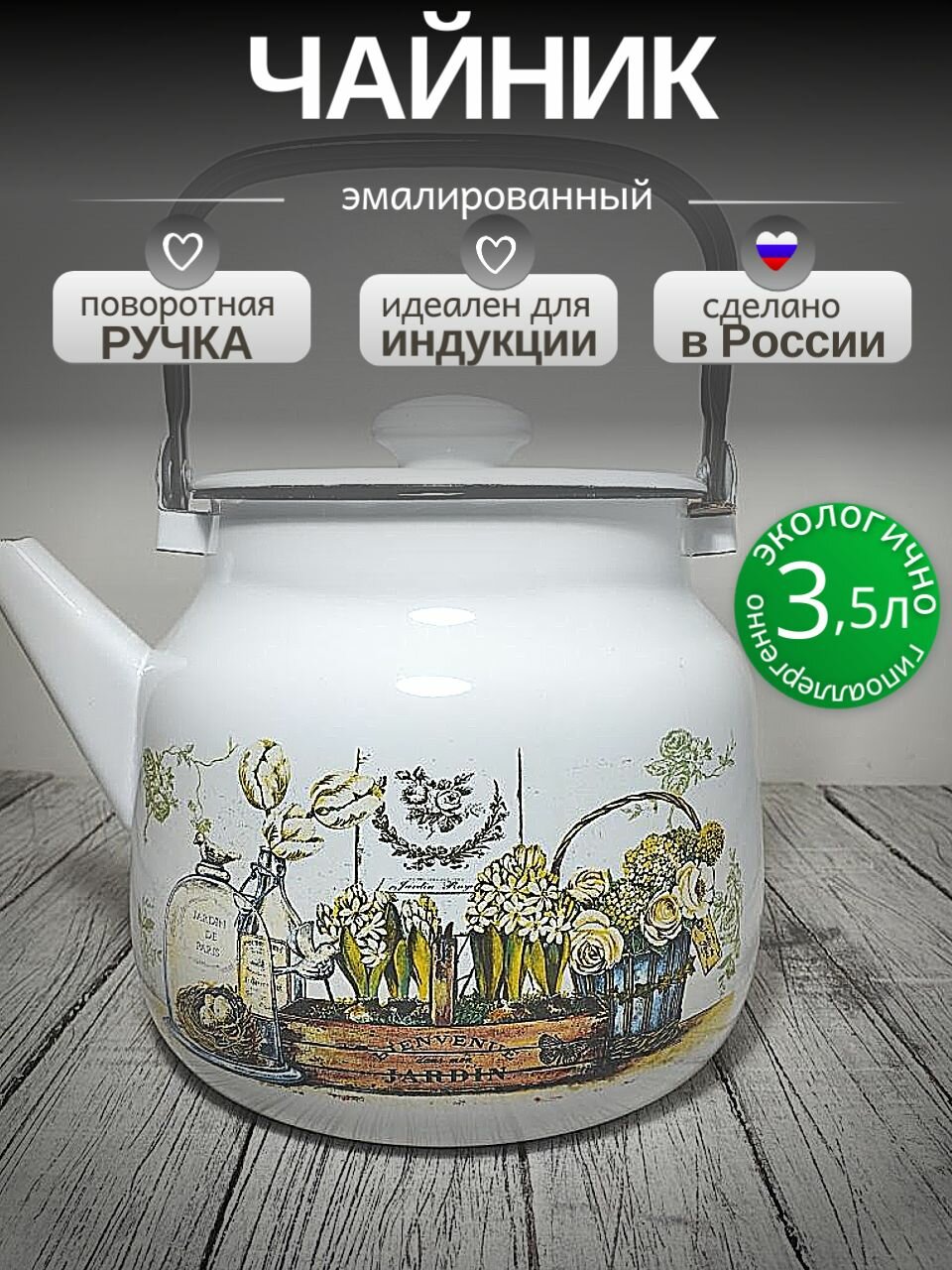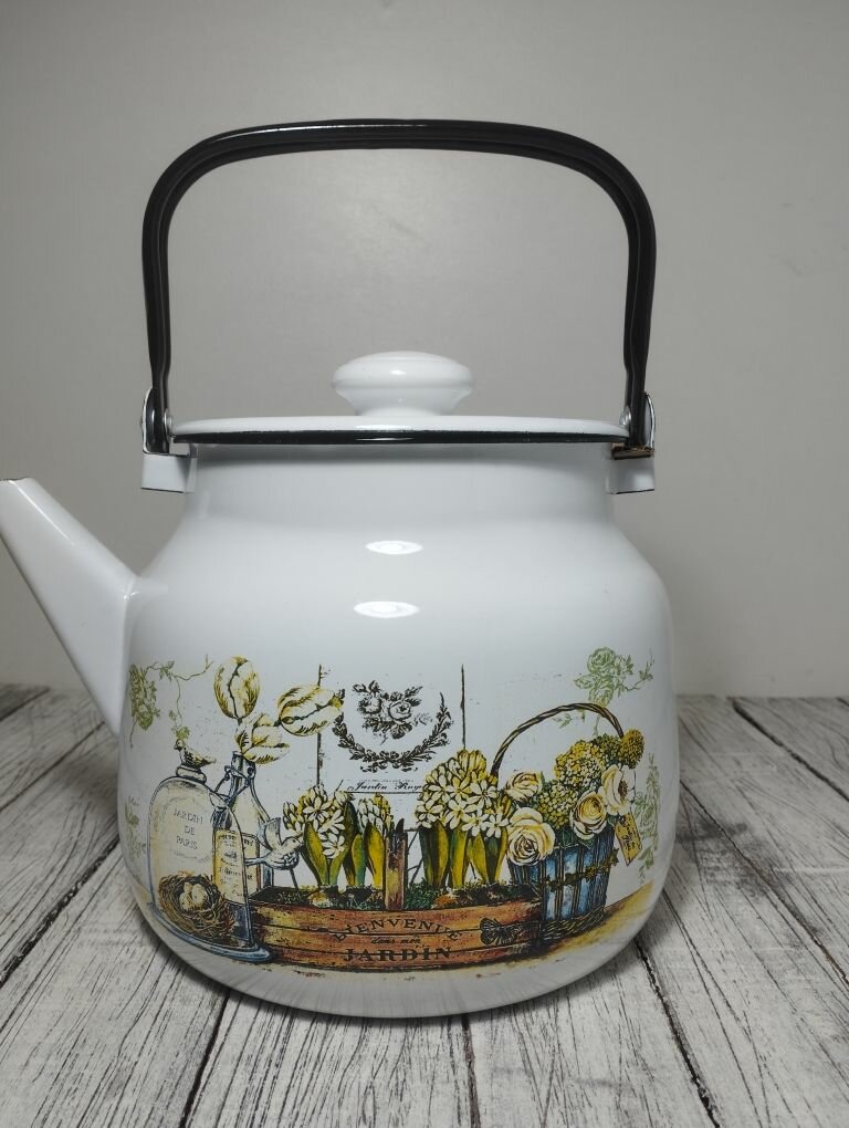 Чайник эмалированный 3,5 литра Лысьва белый летний этюд, подвижная ручка, все виды плит, индукция