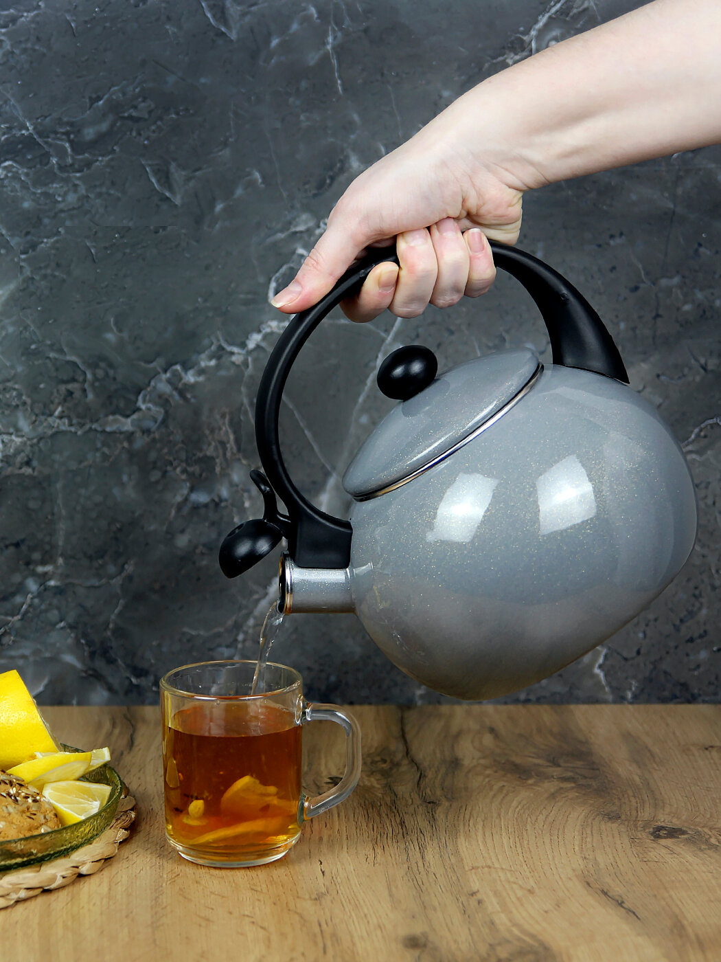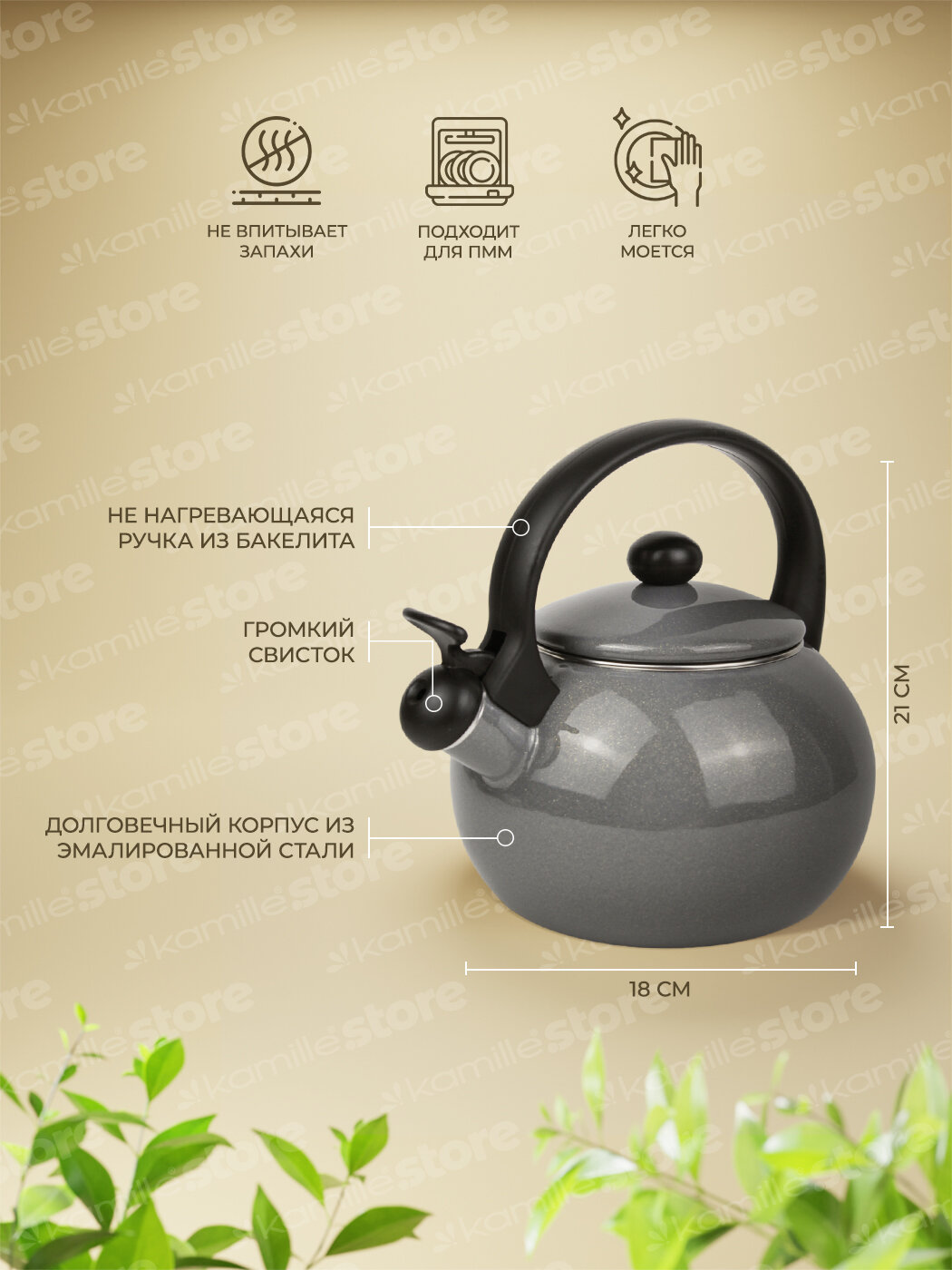 Чайник 2,2 л. эмалированный со свистком Kamille KM 1038D с черной бакелитовой ручкой (2,2 л. / серый) интересное: