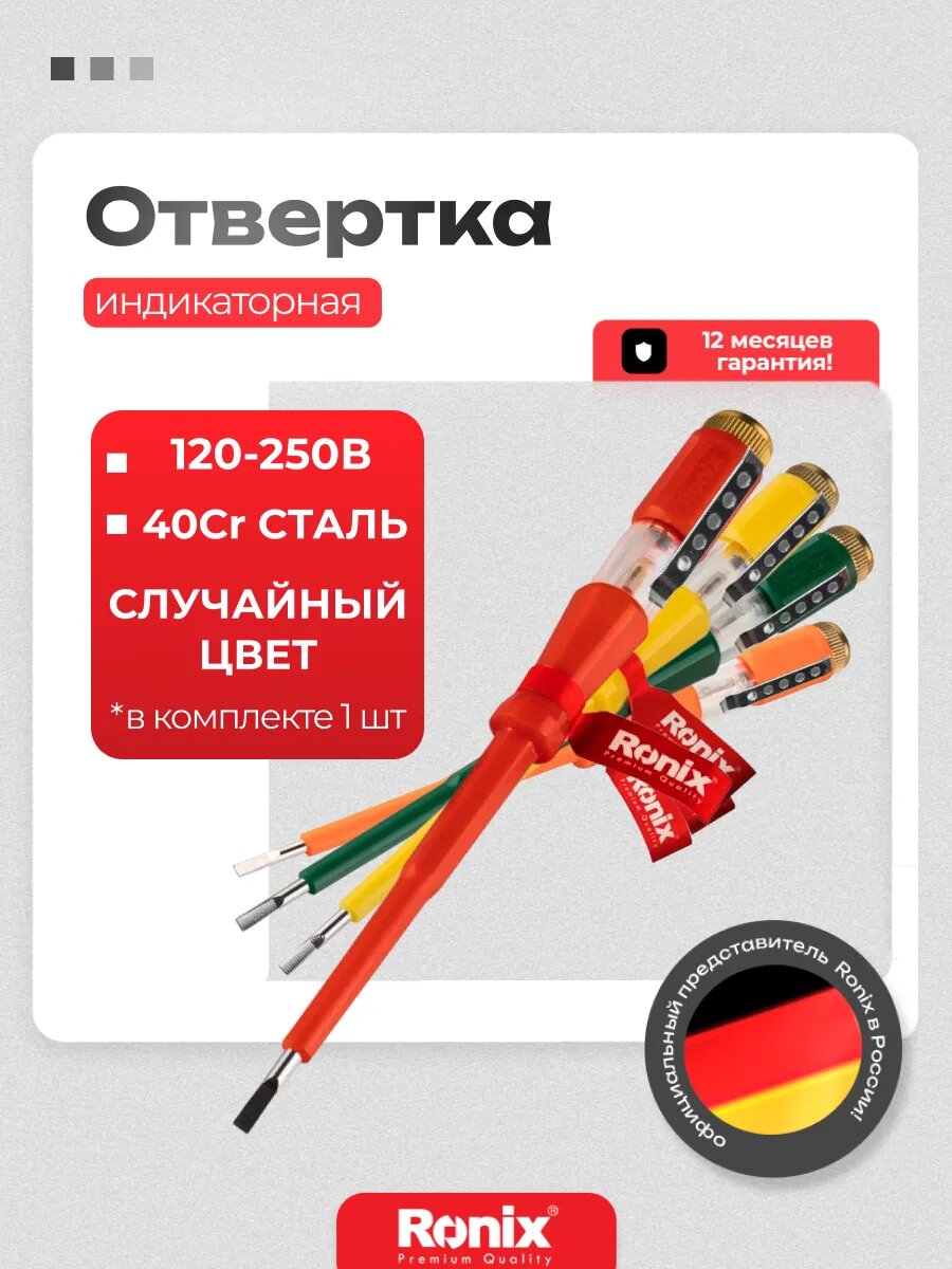Отвертка индикаторная RONIX плоская шлицевая 140 мм, индикатор напряжения 120-500V для электрика, рандомный цвет интересное: