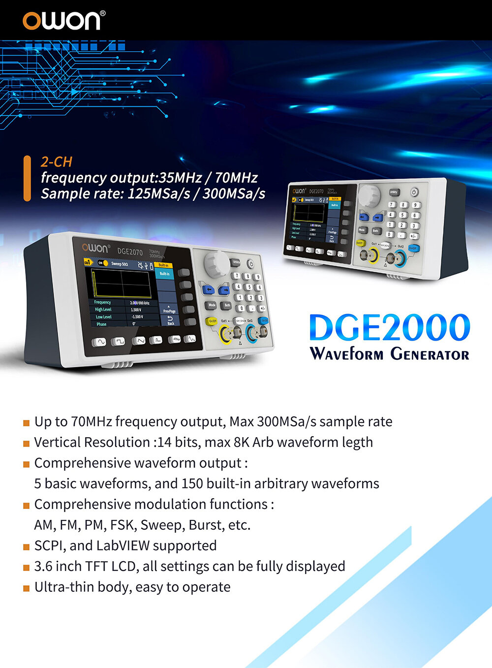 OWON DGE2070 2 Канал 70 МГц генератор любой формы волны, 14 - битное разрешение, выборка 300MSA / s, длина 8K интересное: