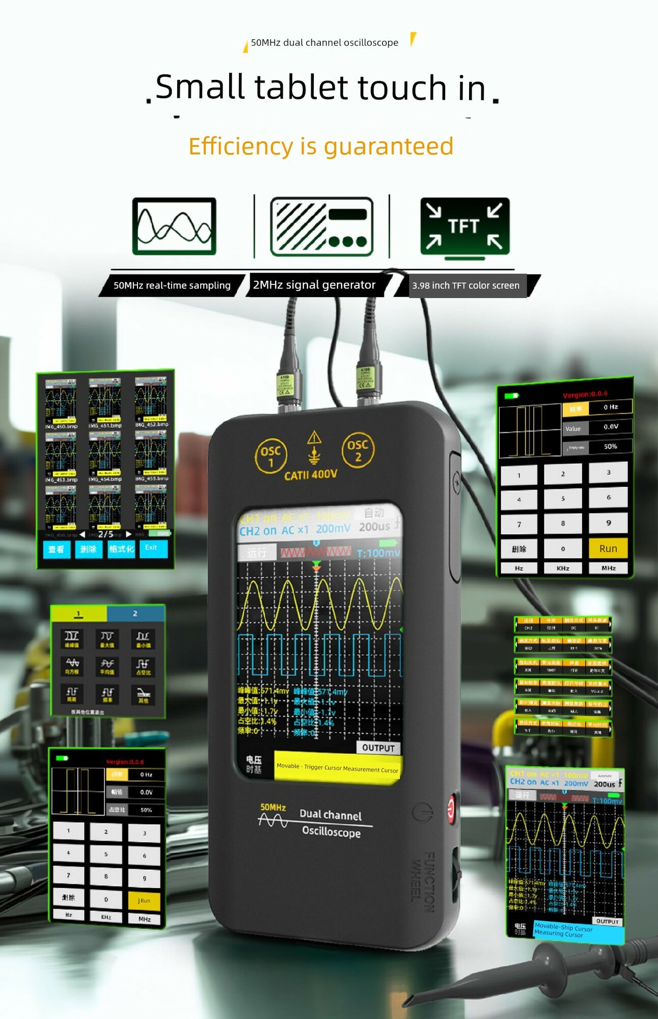 Портативный двухканальный осциллограф 50 МГц с генератором сигналов и зажимом "крокодил" интересное: