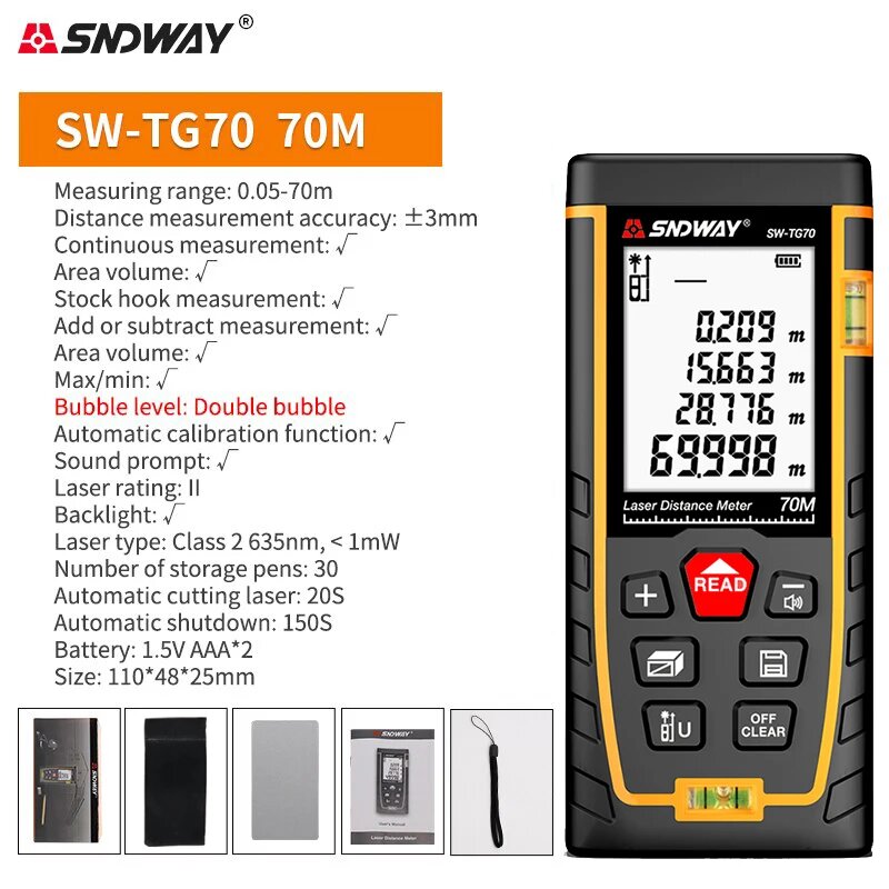 Ниже Вы можете прочитать отзывы на SNDWAY Лазерный дальномер SW TG50/TG70/TG100/TG120, SW-TG70 70M, ознакомится с подробными характеристиками, посмотреть интересные обзоры и фотографии на SNDWAY Лазерный дальномер SW TG50/TG70/TG100/TG120, SW-TG70 70M.