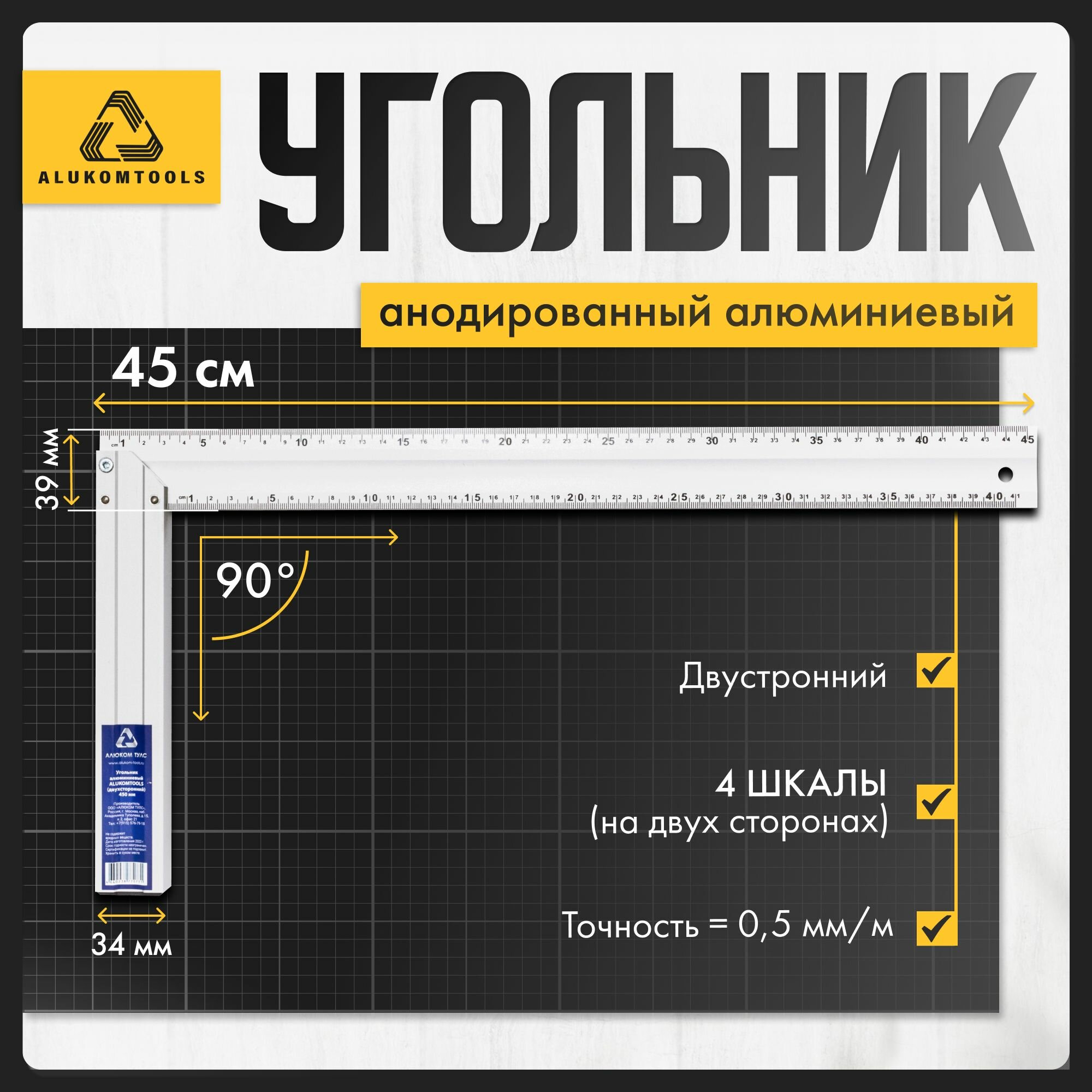 Угольник строительный металлический, 45 см, двусторонняя шкала, алюминиевый ALUKOMTOOLS интересное: