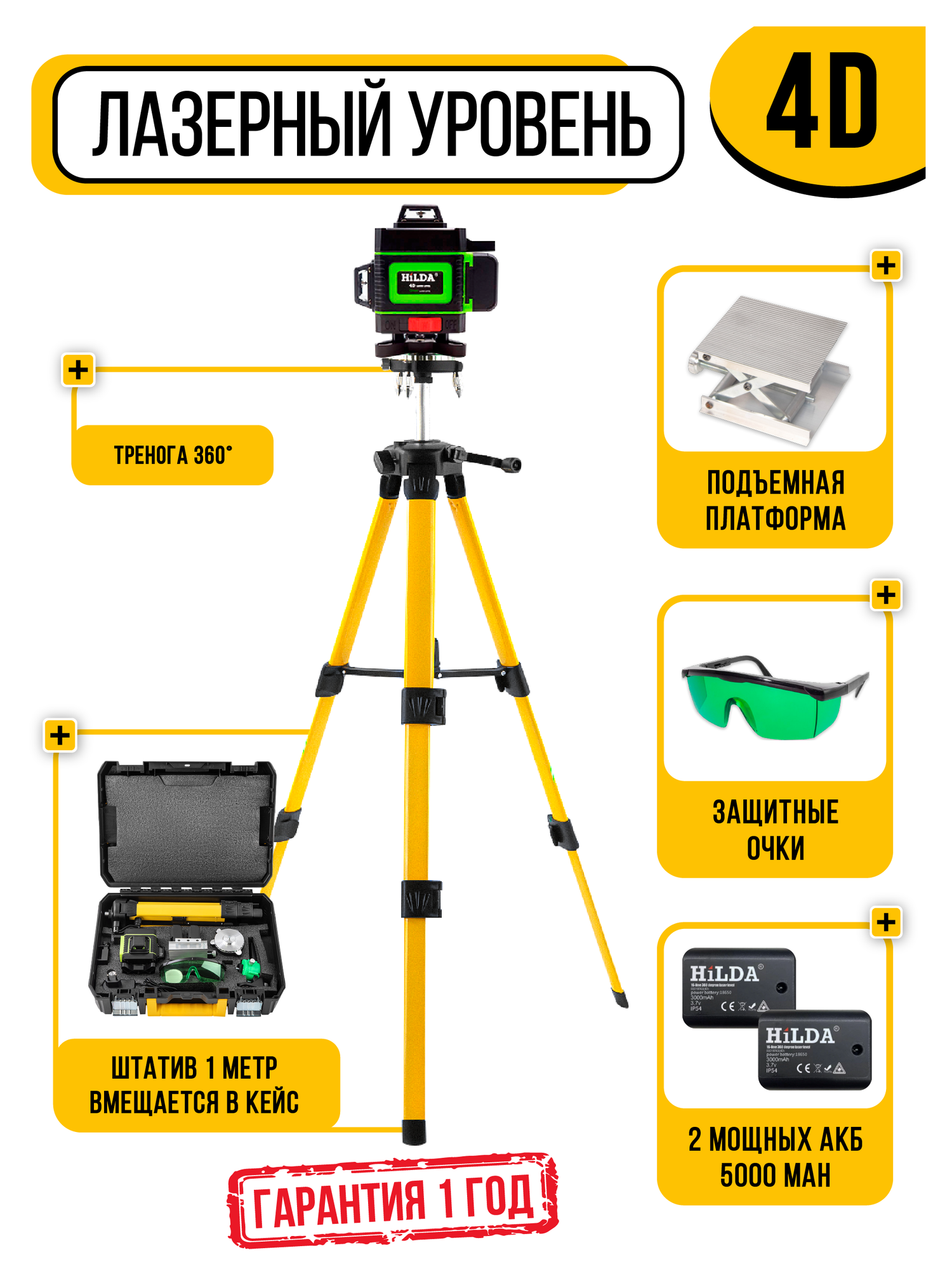 Лазерный уровень 4D 16 линий с 2 аккумулятора, тренога 360 + Штатив 1м. интересное: