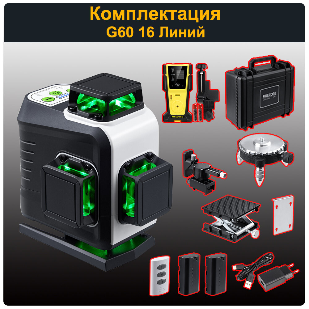 Лазерный уровень/нивелир FIRECORE G60, 4D 16 Линий, Зеленый луч, 2 акб, приемником FD30 интересное: