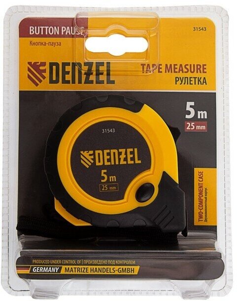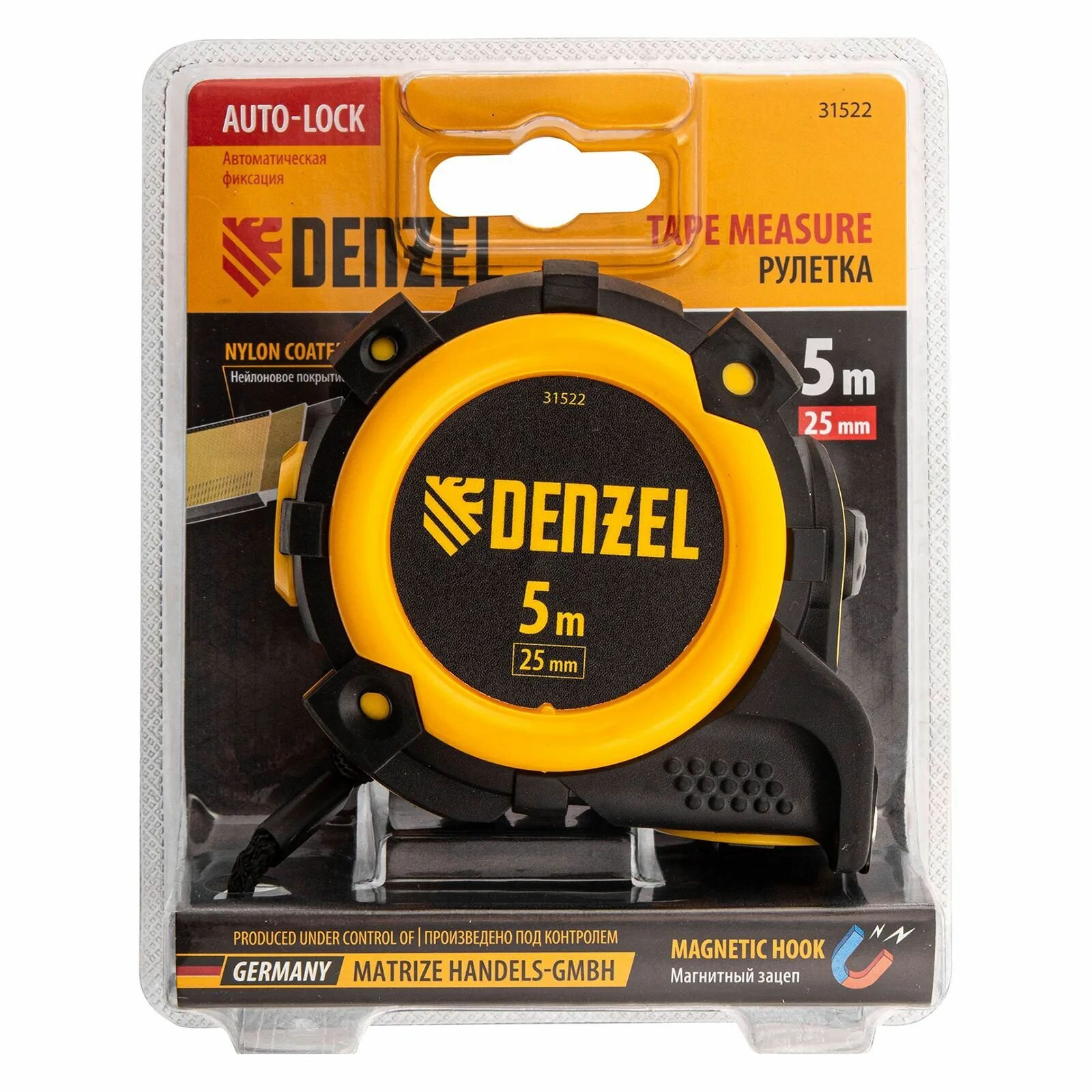 Купить Рулетка Denzel 5м х 25ммавтоматич. фиксац, нейлон. покрытие, магнит. зацеп, двухстор. разметка 31522