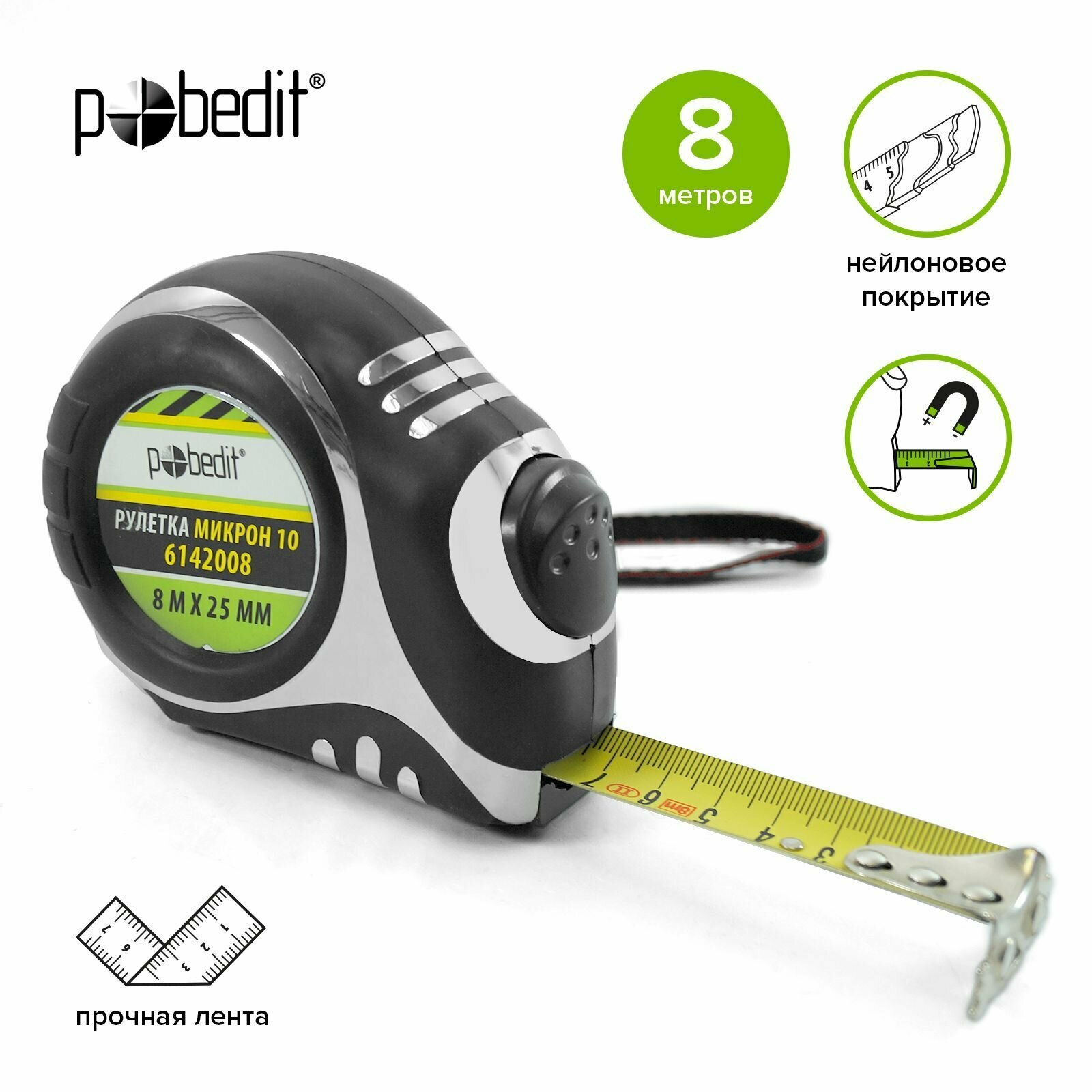 Рулетка строительная 8м х 25мм, обрезиненный корпус Pobedit интересное: