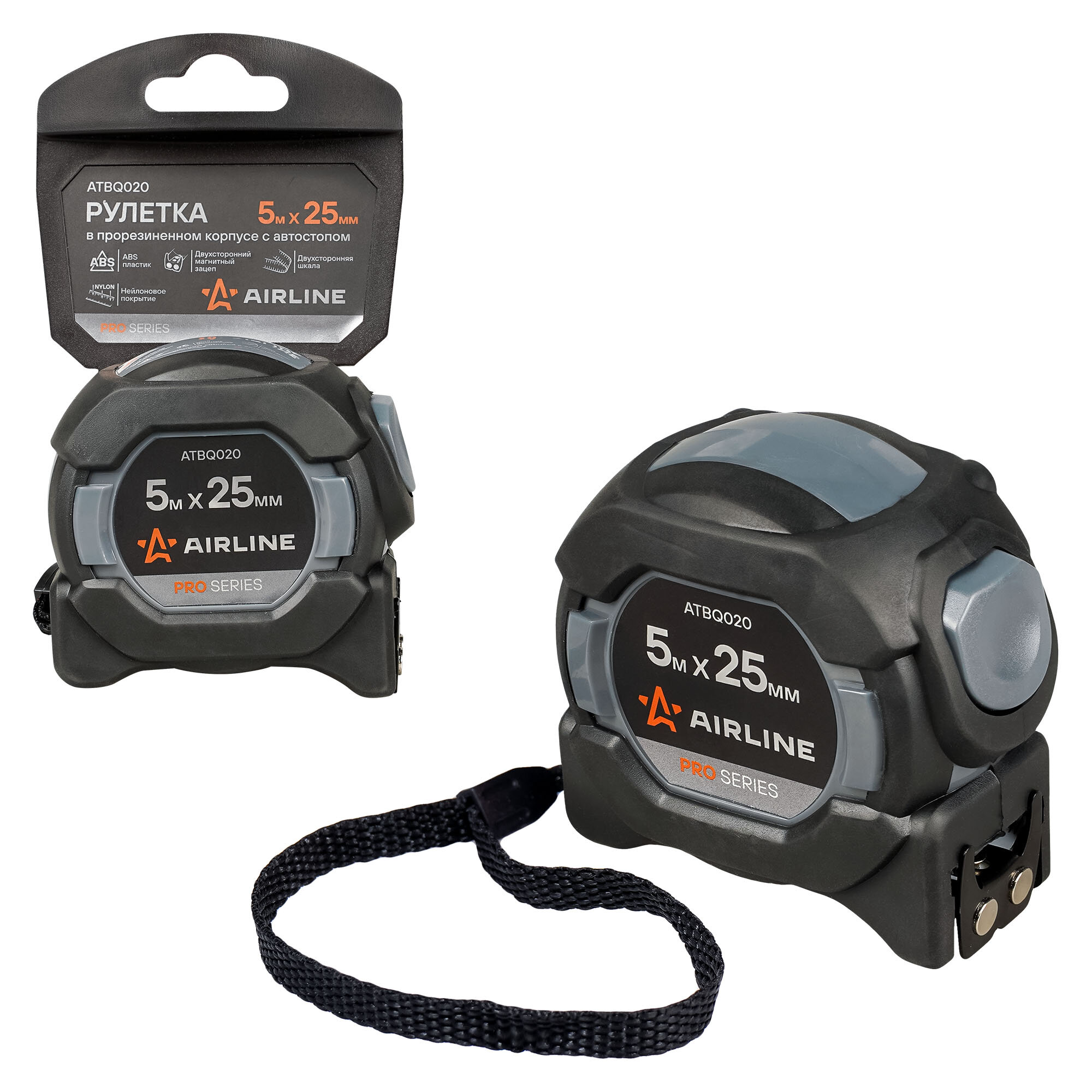 Рулетка в прорезиненном корпусе 5мх25мм PRO, автостоп, дв. магнит. зацеп, нейлон. двуст. шкала ATBQ020 AIRLINE интересное: