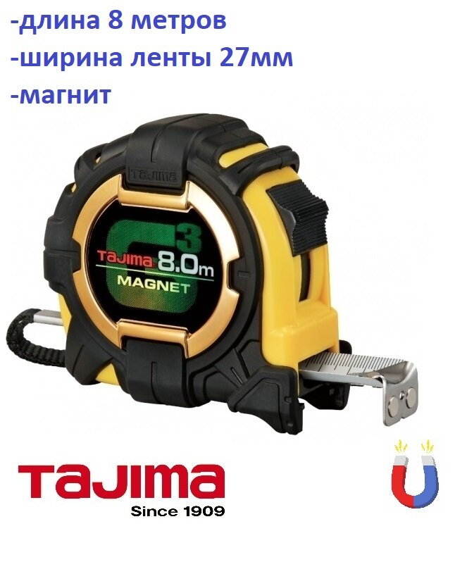 Рулетка TAJIMA G3 LOCK27 8м/27мм (G3M780MT) с магнитным зацепом, обрезиненный корпус, 2-х сторонняя шкала интересное: