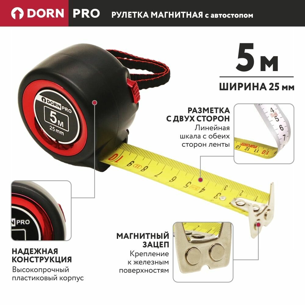 Рулетка с автостопом DORN PRO магнитная 5 м х 25 мм нейлоновое покрытие интересное: