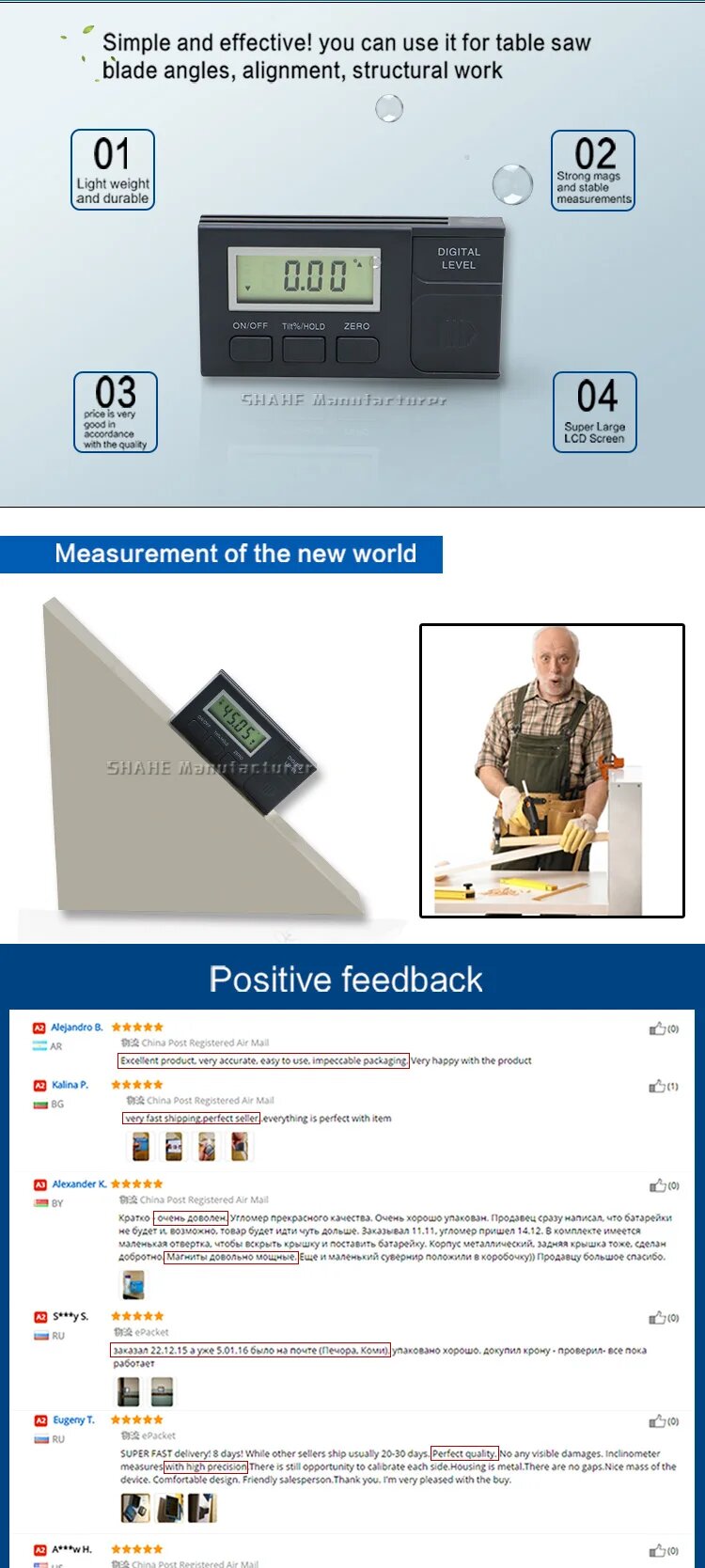 Ниже Вы можете прочитать отзывы на Цифровой угломер Shahe, ознакомится с подробными характеристиками, посмотреть интересные обзоры и фотографии на Цифровой угломер Shahe.