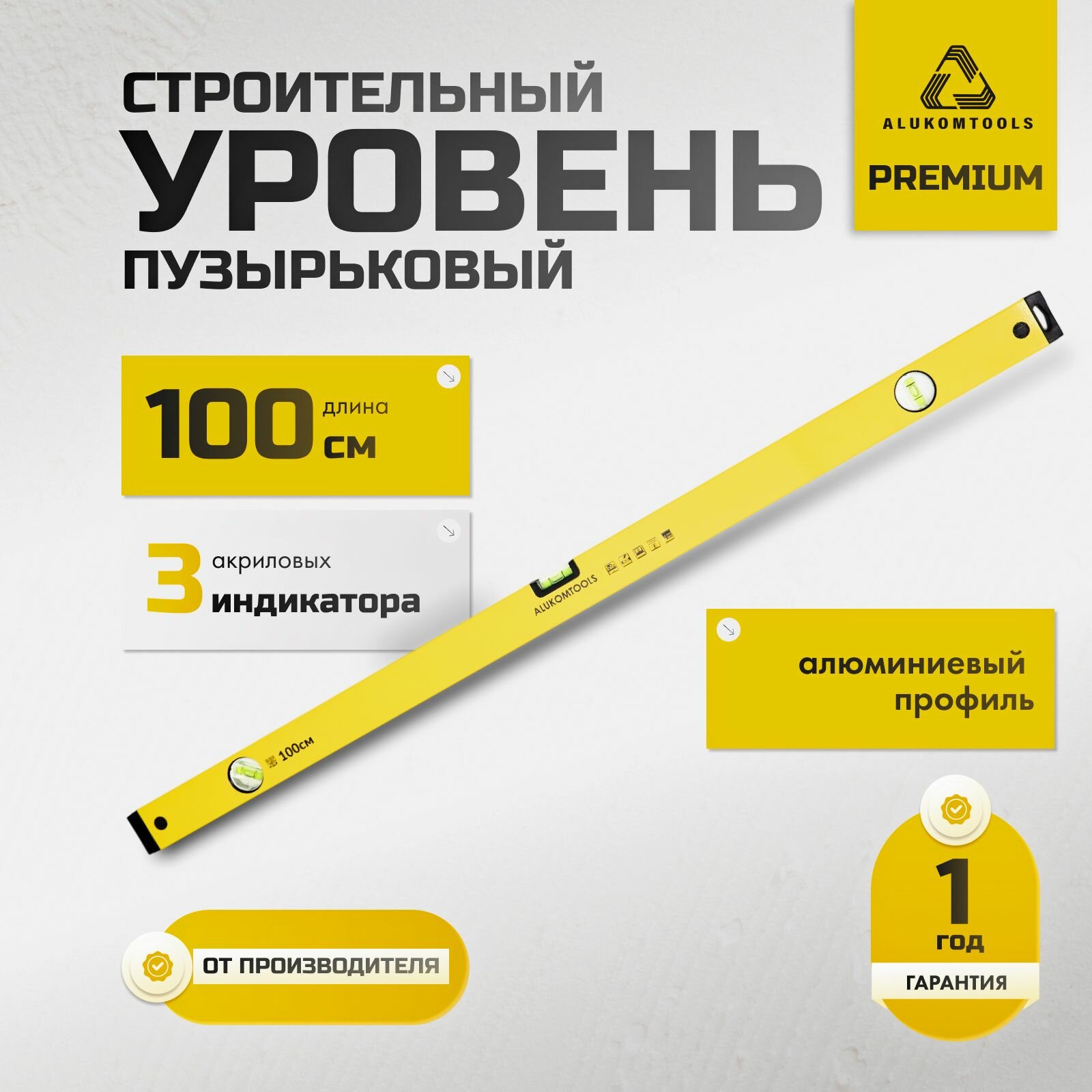 Уровень строительный окрашенный пузырьковый, 100 см, алюминиевый, PREMIUM ALUKOMTOOLS интересное: