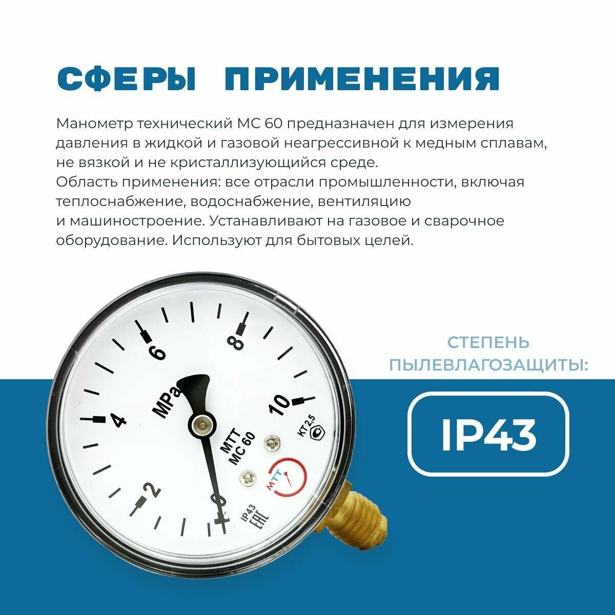 Манометр МС60 давление 0-10 МПа (100 бар) резьба М12х1.5 класс точности 2,5 корпус 62 мм. поверка 2 года интересное: