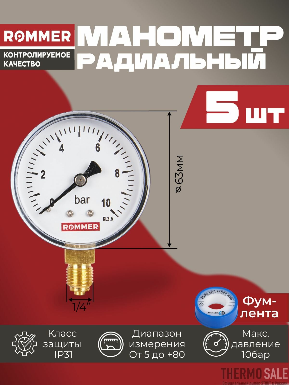 Манометр для водоснабжения 1/4 радиальный комплект 5 шт корпус Dn 63 мм 0-10 бар, кл.2.5, ФУМ лента интересное: