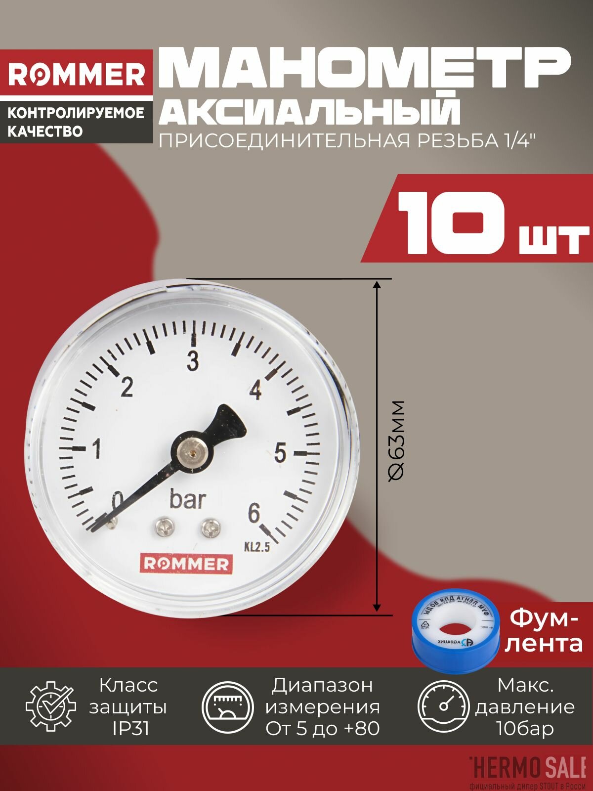 Манометр для водоснабжения 1/4 аксиальный комплект 10 шт корпус Dn 63 мм 0-10 бар, кл.2.5, ФУМ лента интересное: