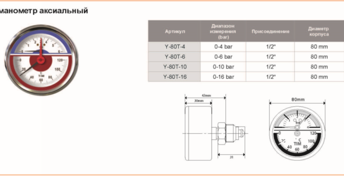 Термоманометр аксиальный 1/2" - 6 бар, 0 - 120 гр. TIM Y-80T-6 интересное: