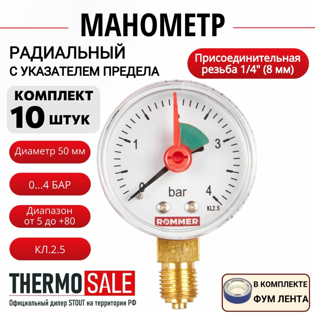 Манометр радиальный с указателем предела 10 шт корпус Dn 50 мм 1/4", 0-4 бар, кл.2.5, ФУМ лента интересное:
