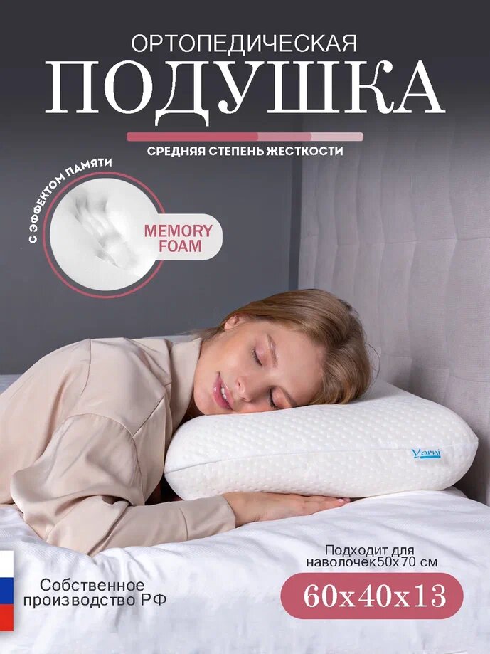 Подушка ортопедическая с эффектом памяти Yarni, для сна в любом положении 60x40x13 см интересное: