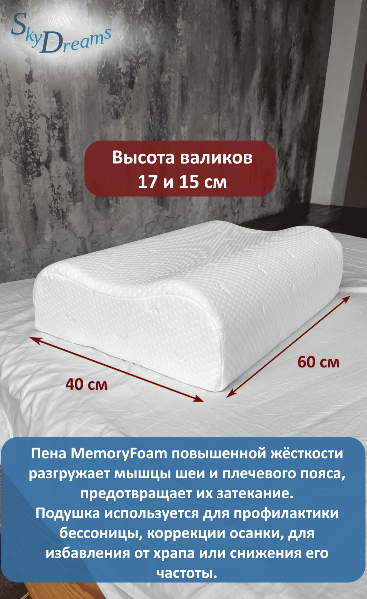 SkyDreams Ортопедическая подушка с эффектом памяти 60*40*17/15 см, ЖЁСТКАЯ интересное: