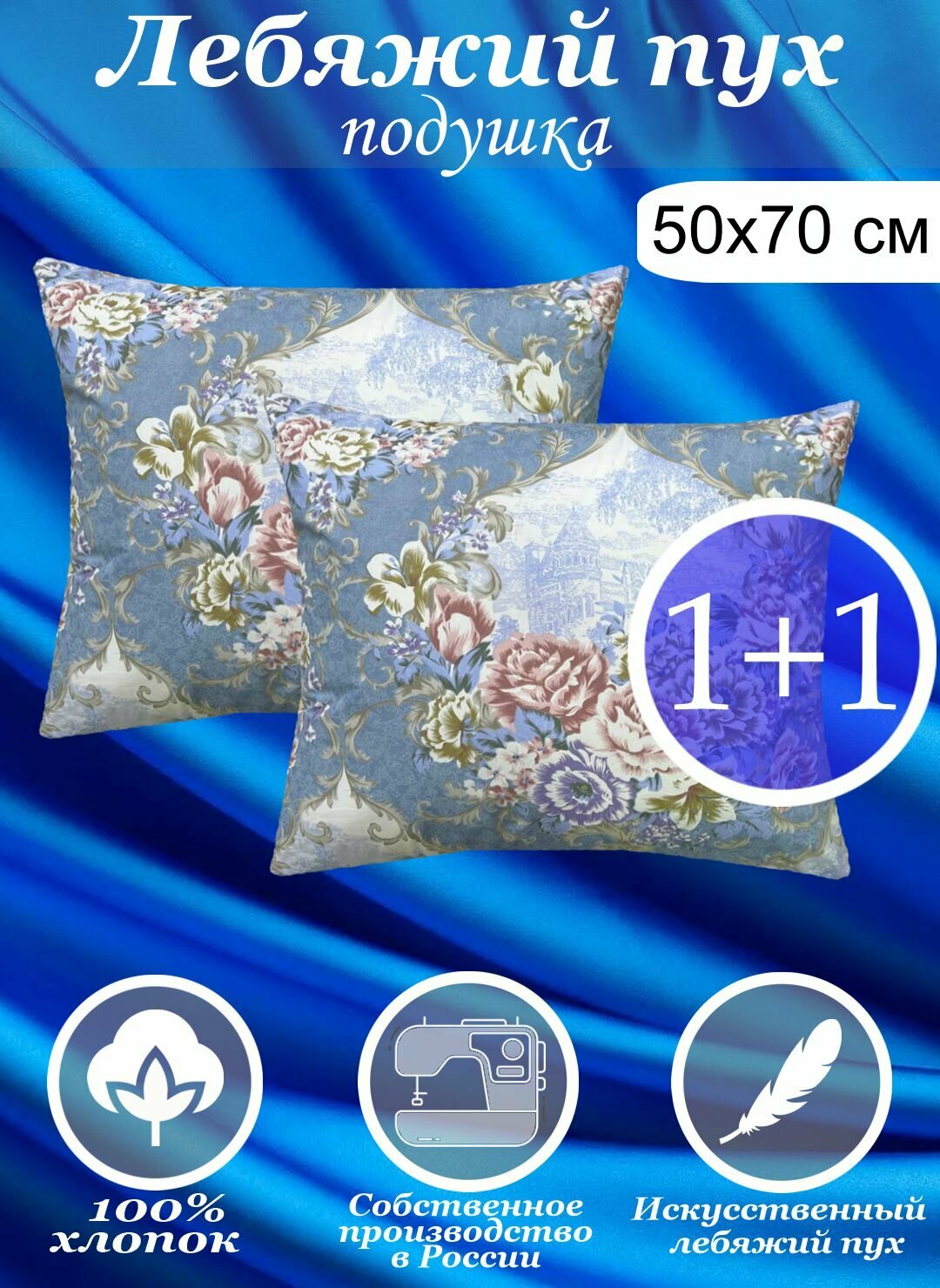 Подушка для сна Kerimov Group, 50x70 см, хлопок, гипоаллергенная, белая и голубая