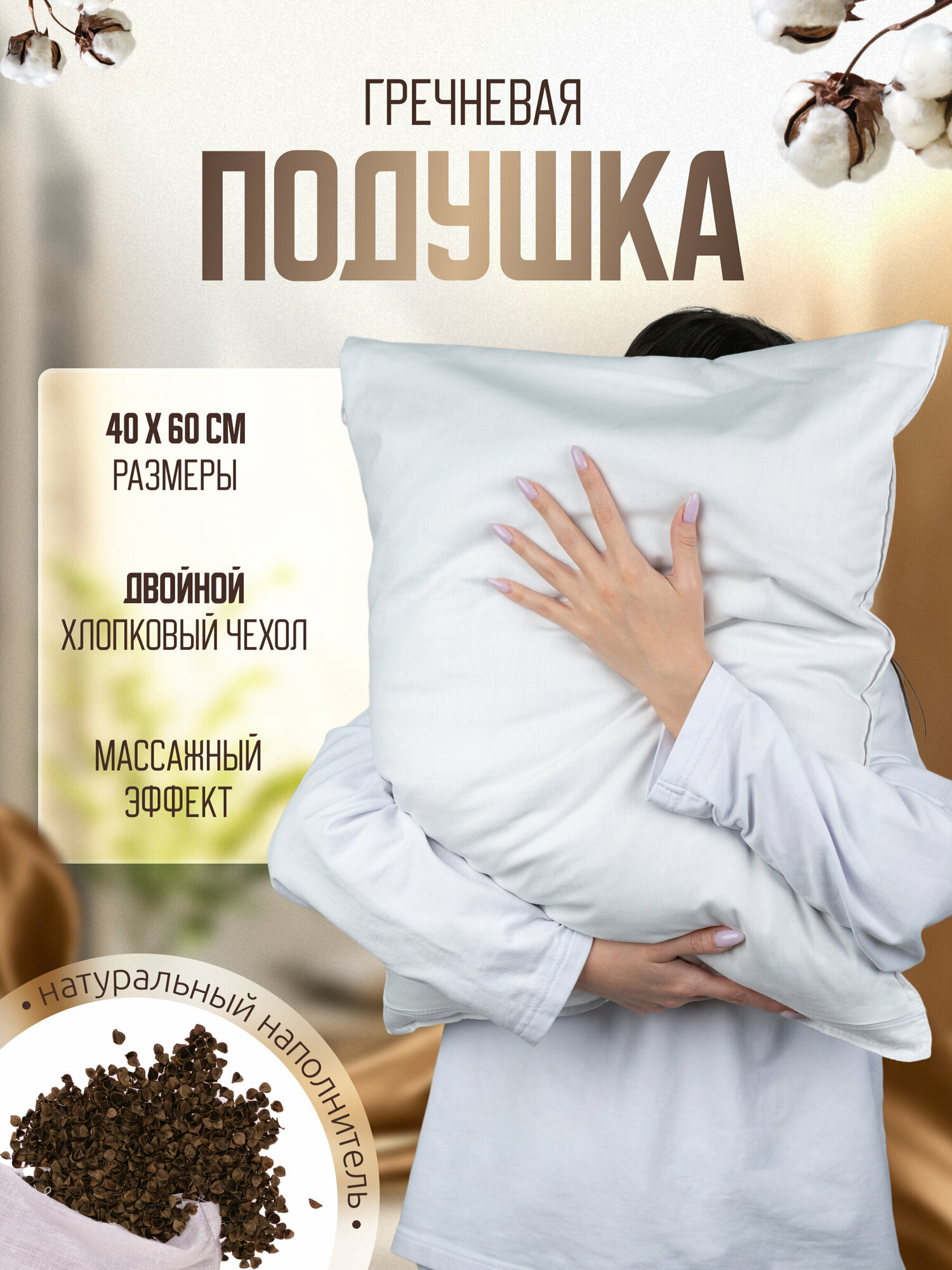 Гречневая подушка Лика в двойном хлопковом чехле на молнии, 40 х 60 см, высота 10 см, белая интересное: