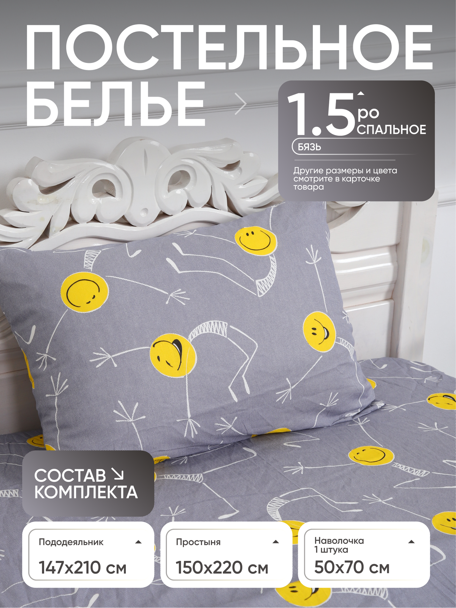 СохранитьПостельное белье Текстиль Отель "Смайлы", 1,5 спальное, бязь, хлопок, комплект 3 предмета интересное: