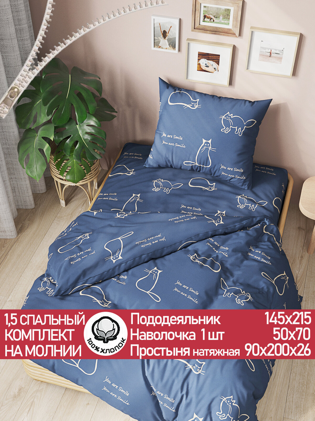 Купить Постельное белье Сказка "Котики" 1,5-сп наволочка 50х70 1шт Простынь на резинке 90х200 см Пододеяльник 145х215 см