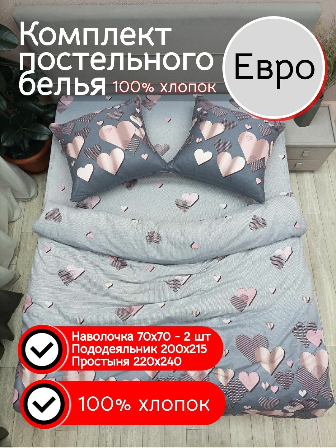 СохранитьПостельное бельё Kerimov Group, бязь, евро, хлопок 100%, цвет серый/розовый интересное: