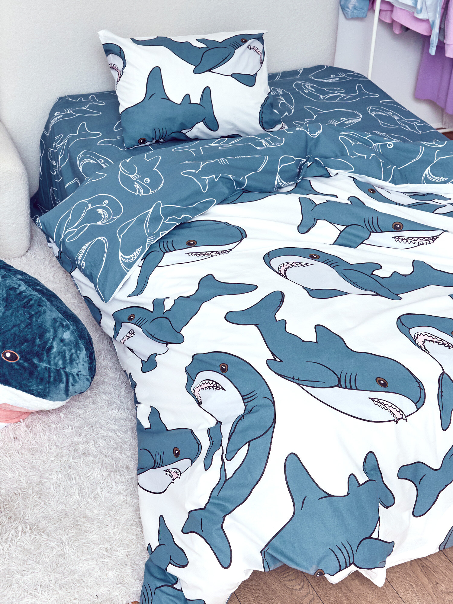 Постельное белье 1.5 спальное Crazy Getup, Перкаль, нав. 70х70, Plush sharks