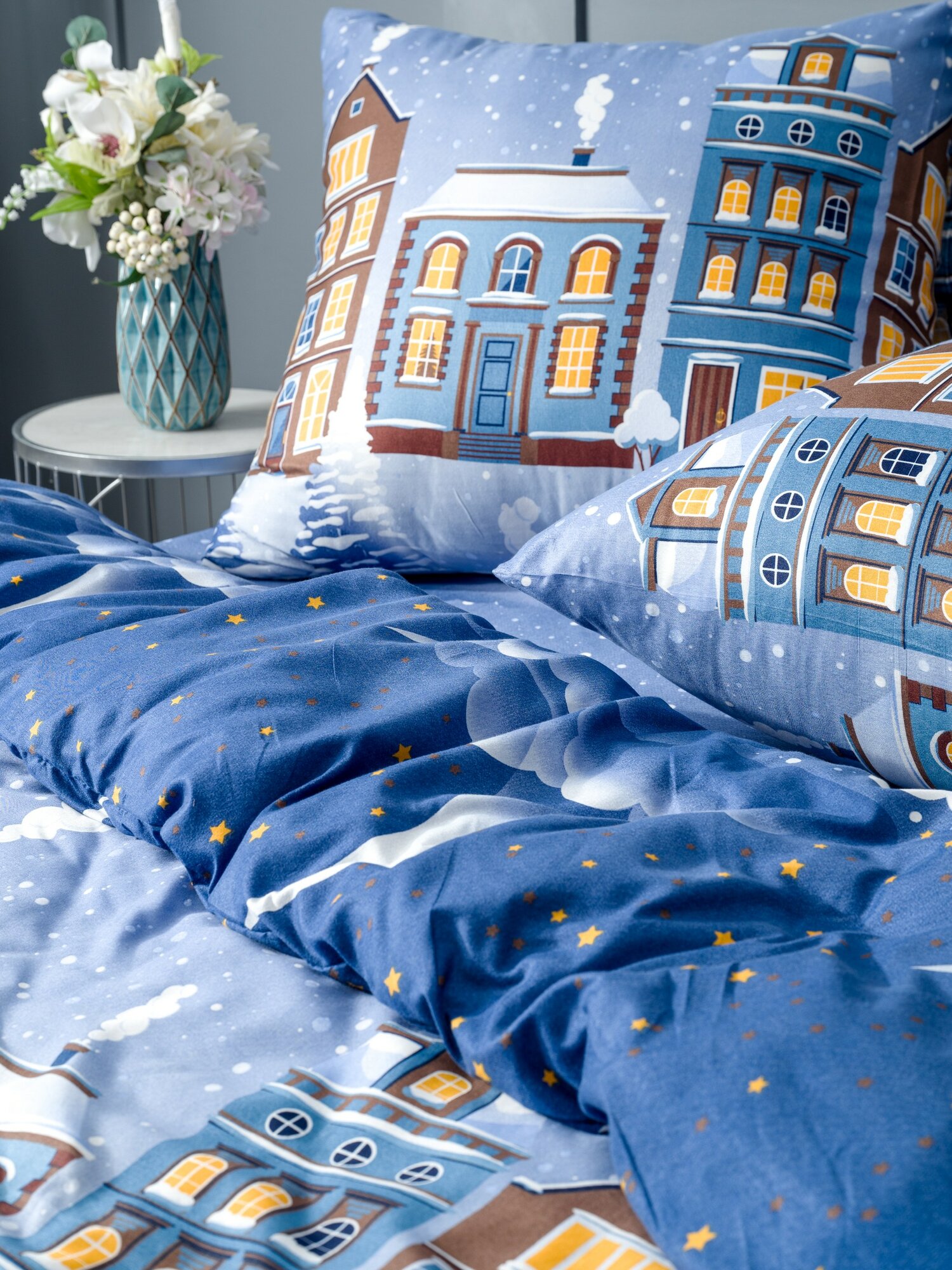 Постельное белье 2 спальное с европростыней Павлина Ночной город, Полисатин, наволочки 70x70