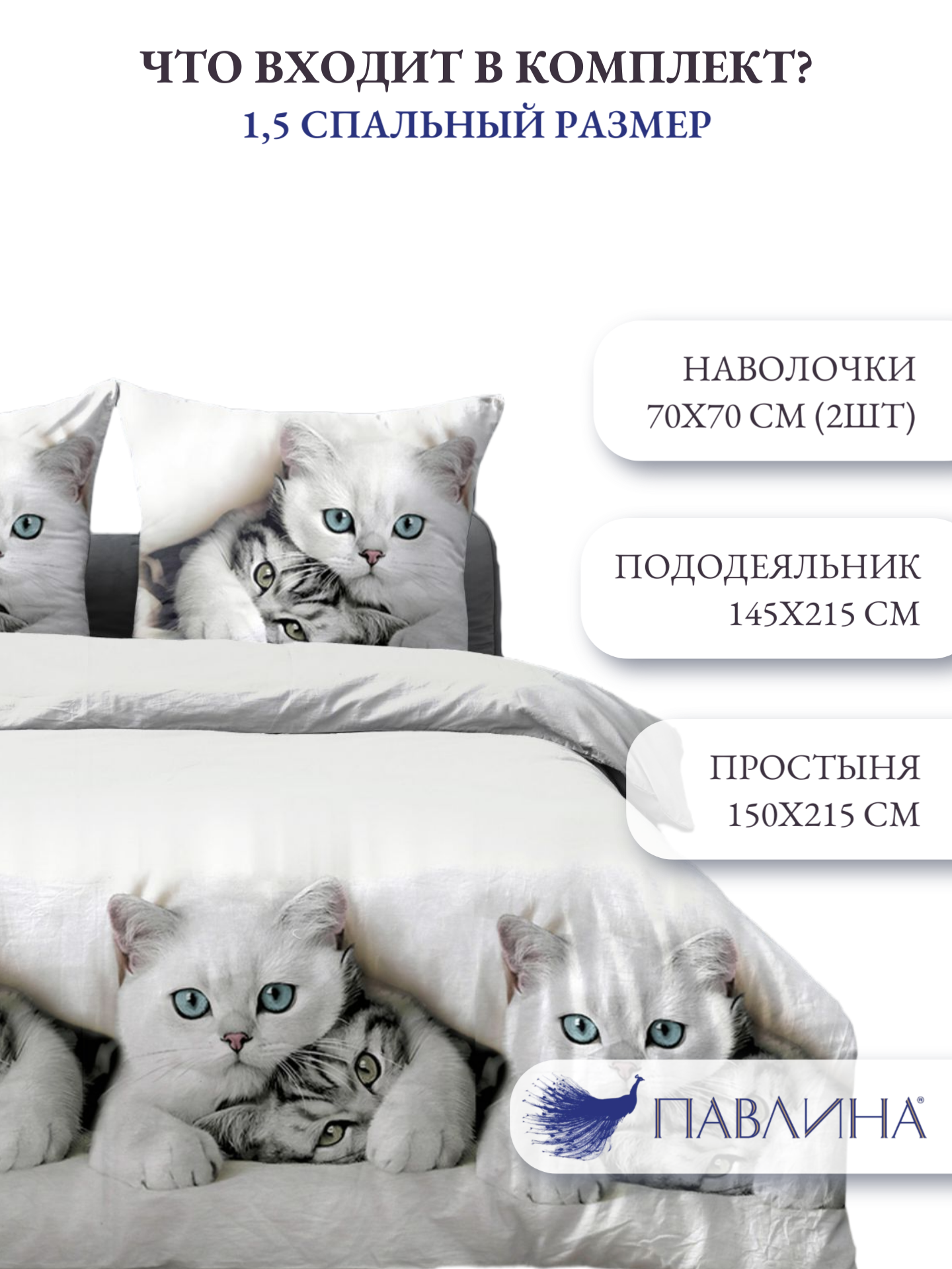 СохранитьПостельное белье 1.5 спальное Павлина Котики белые, Полисатин, наволочки 70x70 интересное: